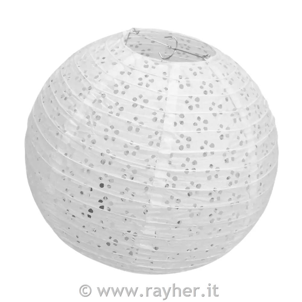Papirnati lampijon s čipko, s kovinsko žičnato konstrukcijo, premer 25 cm, ki ga lahko obesimo. Enostavno se ga sestavi in uporabi za različne dekoracije. Dodatno ga lahko okrasimo in pobarvamo.