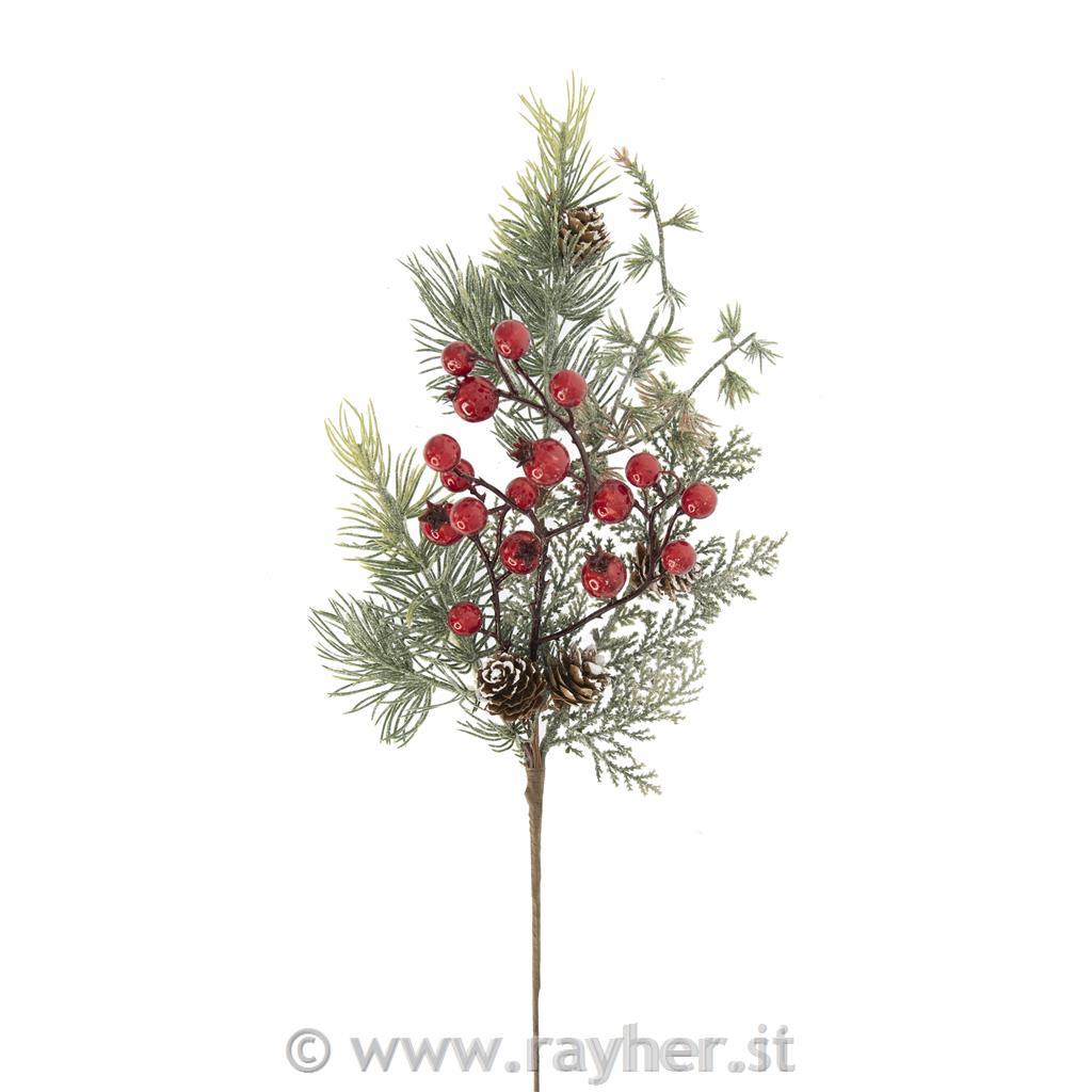 Prikupna dekorativna veja bora z rdečimi jagodami in naravnimi storži bo odličen dodatek vašim prazničnim aranžmajem. Dolžina 46 cm omogoča enostavno uporabo v božičnih venčkih, šopkih ali kot samostojen okras. Popestrila bo vaš dom in pričarala toplino narave v prazničnem času.