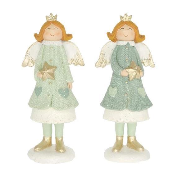 Dekorativni angelček, ki v rokah drži zvezdico, je okrašen z bleščečimi detajli, ki poudarijo praznični čar. Na voljo je v dveh barvnih različicah, velikosti 7 × 5 × 16 cm. Figurica je popoln dodatek za božično mizo, polico ali praznično vasico, saj v dom vnese občutek miru, topline in čarobnosti.