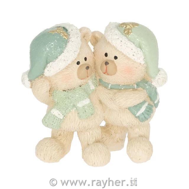 Čudovita zimska dekoracija z motivom dveh ljubkih medvedkov, ki se objemata, bo v vaš dom prinesla toplino in praznično razpoloženje. Oblečena sta v zimska šala in kapici v nežnih pastelnih barvah, kar dekoraciji daje mehak in prikupen videz.