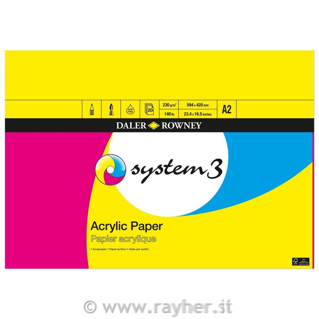 Daler-Rowney blok za akrile System 3 vsebuje 20 listov, 230 g/m2 brez kislinskega lanenega akrilnega papirja za slikanje.