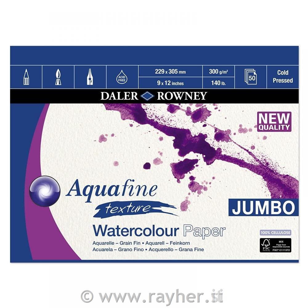 Akvarelni papir Daler Rowney Aquafine Texture ima klasično hladno stiskano površino za akvareliste, ki imajo raje rahlo teksturiran relief. Precejšnja teža 300 g/m2 nudi dobro vpojnost vode, odporna površina pa je zelo enostavna za uporabo in omogoča popravke.