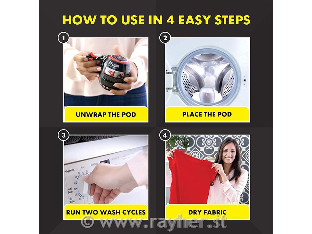ISTRUZIONI Pesare i tessuti e determinare la quantita appropriata di colorante necessaria. Lavare accuratamente i tessuti (senza ammorbidente) per rimuovere macchie. Scartare la pellicola di plastica ed inserire la confezione direttamente nel cestello assieme ai tessuti da tingere gia bagnati. Utilizzare un programma di lavaggio a 40 ° C - senza prelavaggio, modalita economica o 1/2 ciclo. Al termine del ciclo aggiungere il detersivo in polvere e lavare nuovamente il tessuto tinto a 40 ° C. Una volta lavato, asciugarlo all'ombra. Per rimuovere i residui di vernice dalla lavatrice, si consiglia di riavviare la lavatrice vuota con l'aggiunta di detersivo.