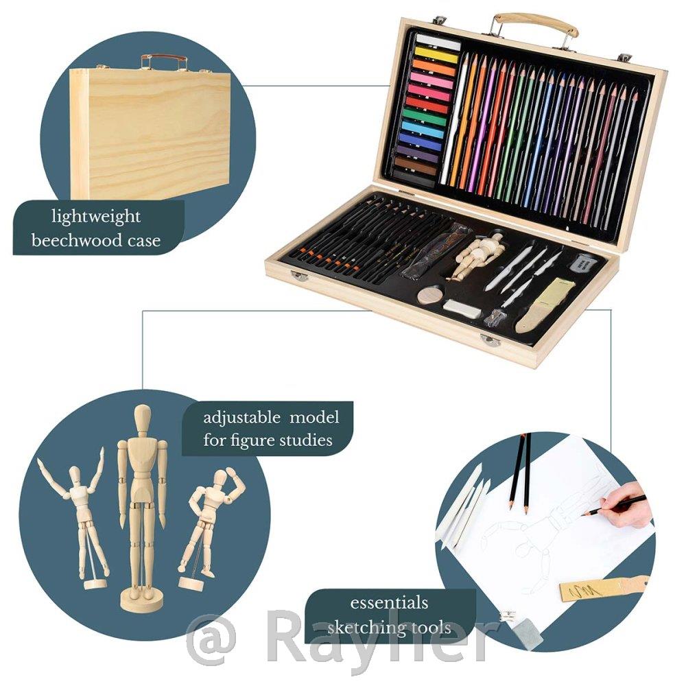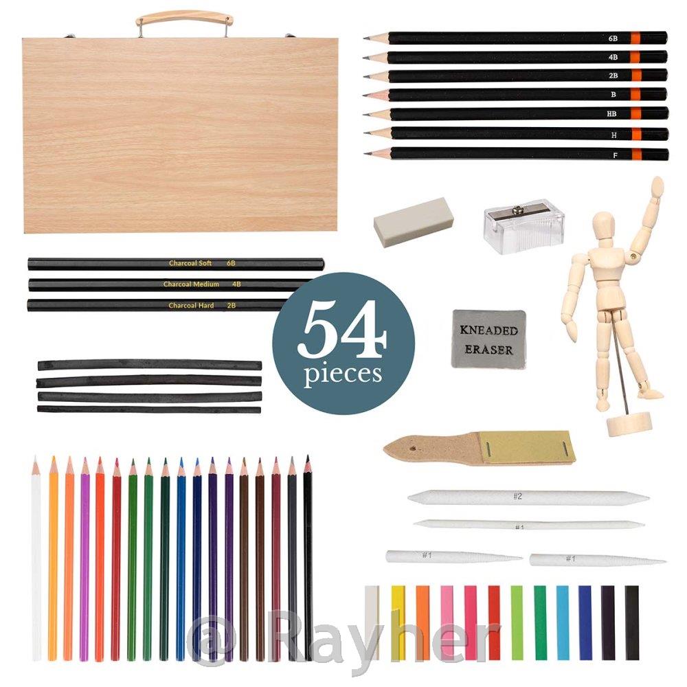 Contains: 18 x Coloured pencils, 12 x Soft pastels, 7 x Sketching pencils, 4 x Vine charcoal sticks, 4 x Blending stumps, 3 x Charcoal pencils, 1 x Eraser, 1 x Kneaded eraser, 1 x Sharpener, 1 x Sandpaper block,4.5" Manikin.
