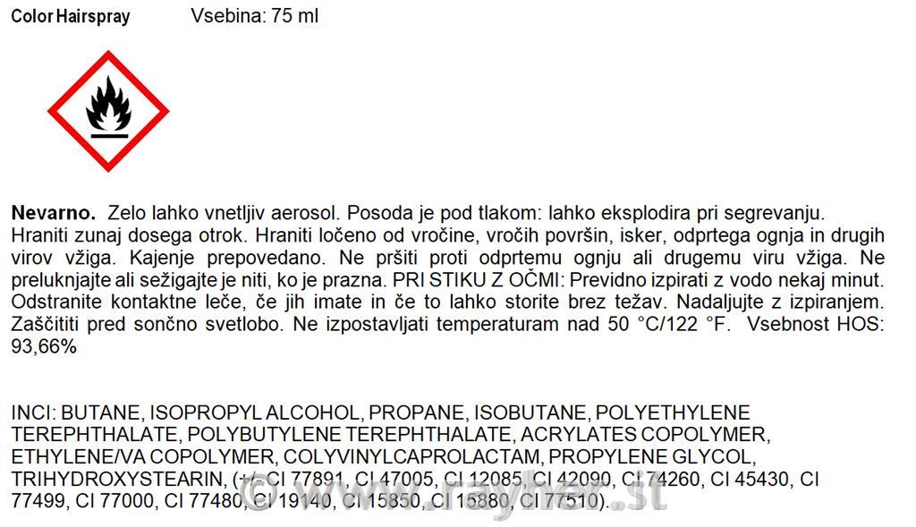 Barva za lase v spreju je primerna za barvanje naravnih las in lasulj. Ni primerna za uporabo na beljenih ali svetlo plavih laseh. Pred uporabo dozo dobro pretresite in nanesite z razdalje 30 cm. Odstrani se s pranjem s šamponom. Barvo morate z las sprati pred vsako nadaljno kemijsko obdelavo lasu. Ne pršite po oblačilih.