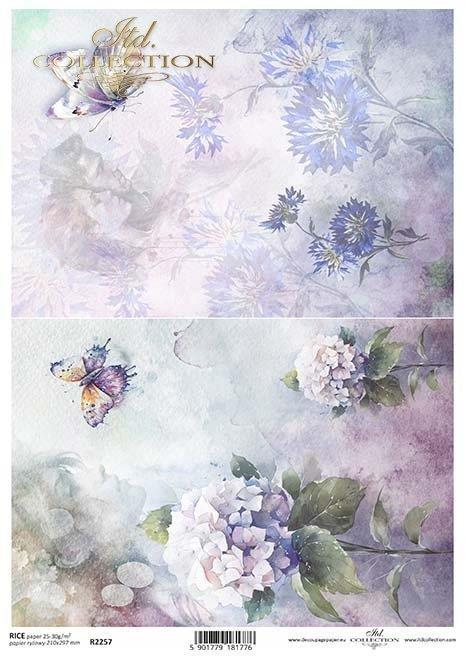 Decoupage papir, rižev A4, Metulj in hortenzija