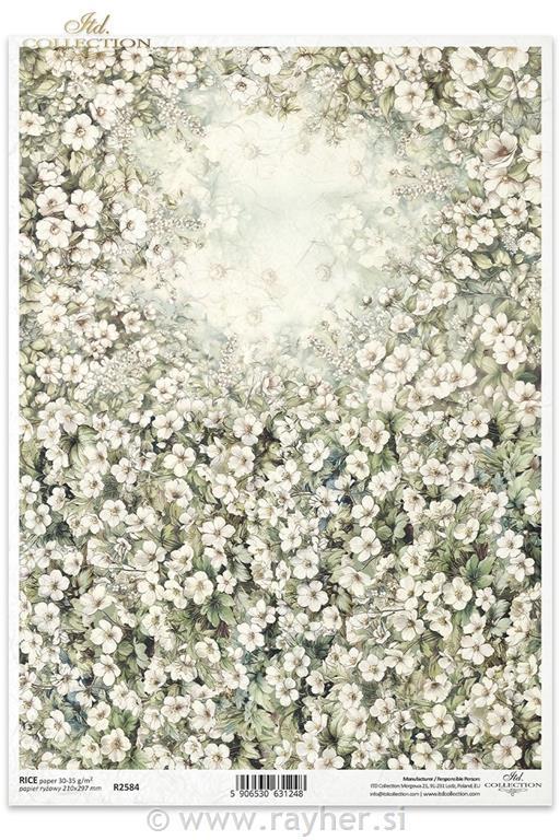 Decoupage papir, rižev A4, Mali beli cvetovi