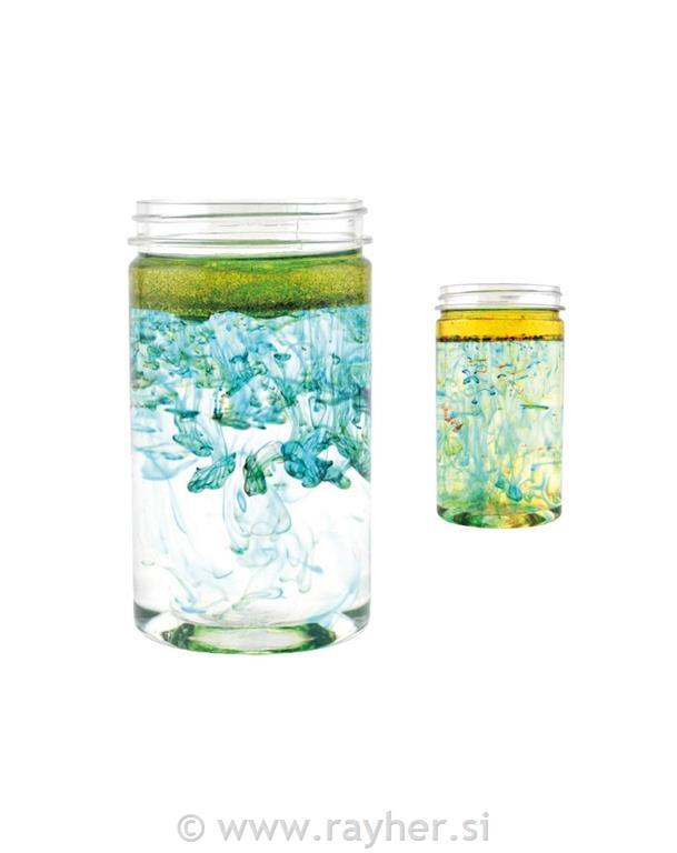 Znanstveno načelo: Ko vliješ olje s pigmentom v čisto vodo, bo zaradi manjše gostote olje plavalo na vodi. Po nekaj minutah, ker je gostota pigmenta večja, se bodo barve potopile v vodo.