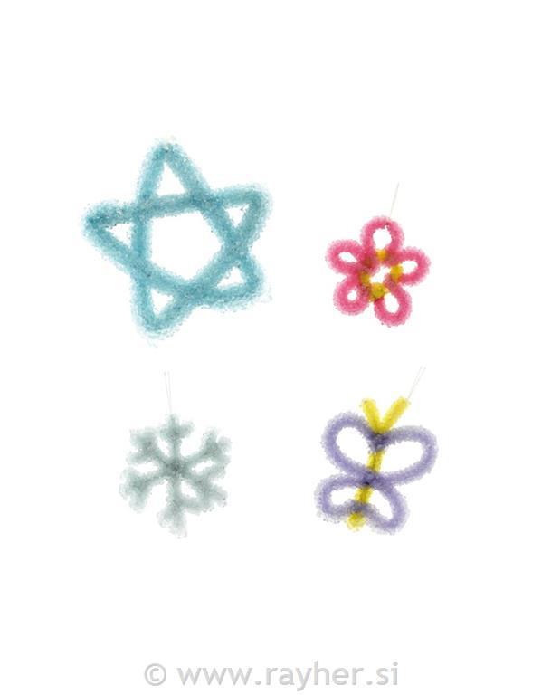 Teorija: Zmešaj kristalni prašek z vročo vodo, nato pusti, da se ohladi. Kristalni prašek se bo oprijel izdelane oblike in kristaliziral. Po nekaj urah boš dobil kristalne oblike.
