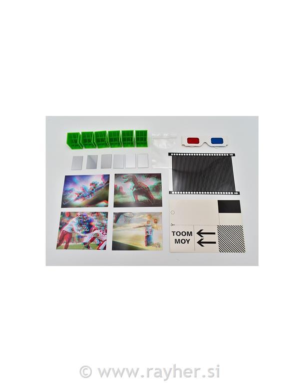1 immagine "Topsy turvy", 1 foglio retinato, 6 cornici per immagini riflettenti, 6 retroriflettori, 1 paio di occhiali 3D, 4 immagini 3D