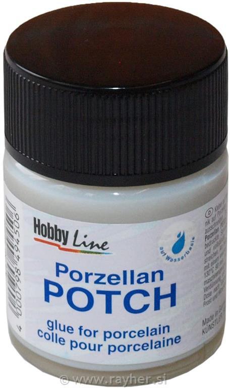 je narejen na vodni osnovi. Porzellan potch je lak in lepilo v enem, namenjeno nanašanju motivov iz papirnatih prtičkov na izdelke iz porcelana ali glazirane keramike. Vedno uporabimo samo zgornji sloj papirnatega prtička! Nanesite Porzellan Potch na del, kamor želite prilepiti prtiček. Na to mesto položite prtiček in ga še enkrat premažite s Porzellan Potchem. Počakajte, da se posuši, nato izdelek zapečite v kuhinjski pečici na 130°C 90 minut. Tako utrjen izdelek lahko pomivate tudi v pomivalnem stroju. Čopič po uporabi operite v mrzli vodi. Lak hranite pri sobni temperaturi.