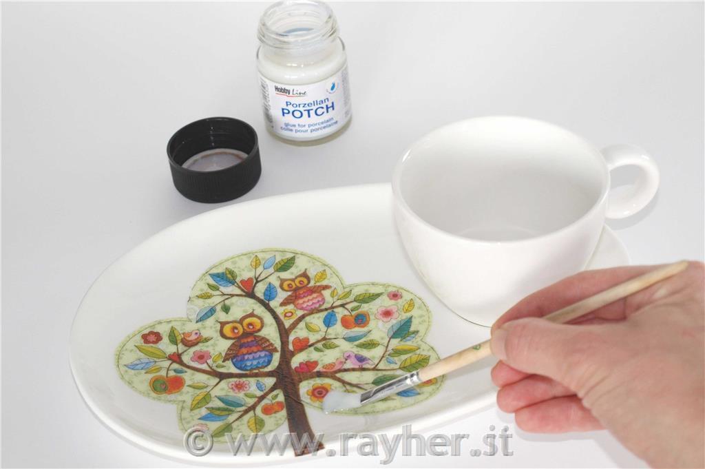 Vedno uporabimo samo zgornji sloj papirnatega prtička! Nanesite Porzellan Potch na del, kamor želite prilepiti prtiček. Na to mesto položite prtiček in ga še enkrat premažite s Porzellan Potchem.