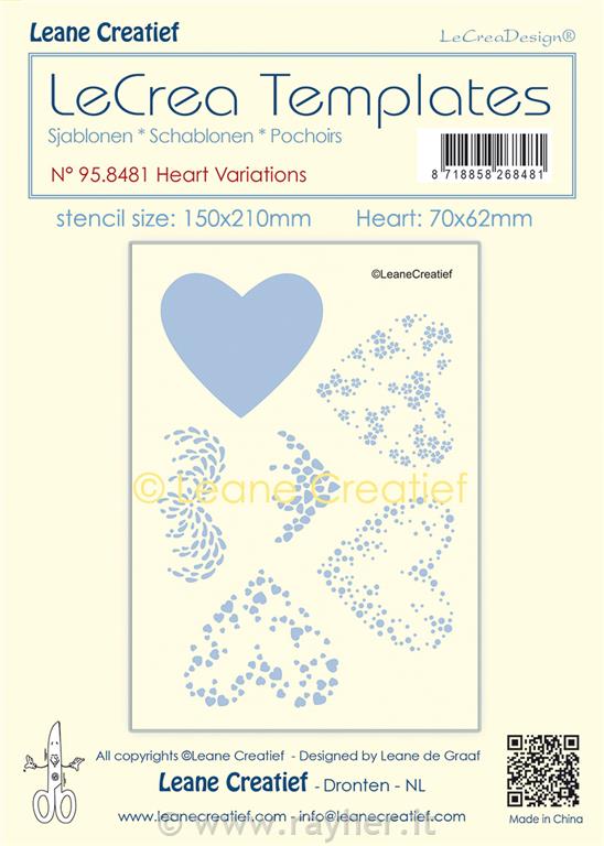 rayher.it Standard craft program Stencils Stencils for paper Stencil: Heart variations Dim.: 150 x 210 mm.Motives: 75 x 62 mm. Sale price:6.95 € SKU:LEA958481 Brand:LeaBelities Stock: on stock Add to basket kos