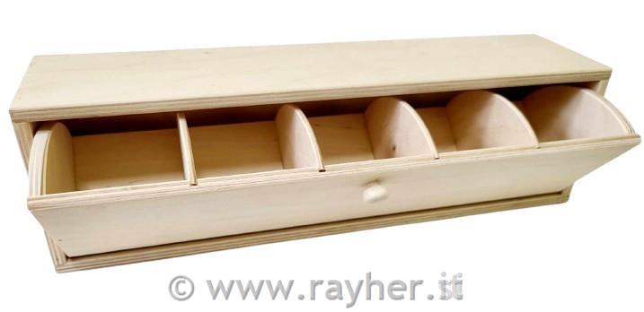 Visoko kakovostna lesena škatla izdelana v EU, z petimi razdelki, ki so primerne velikosti tudi za čajne vrečke.