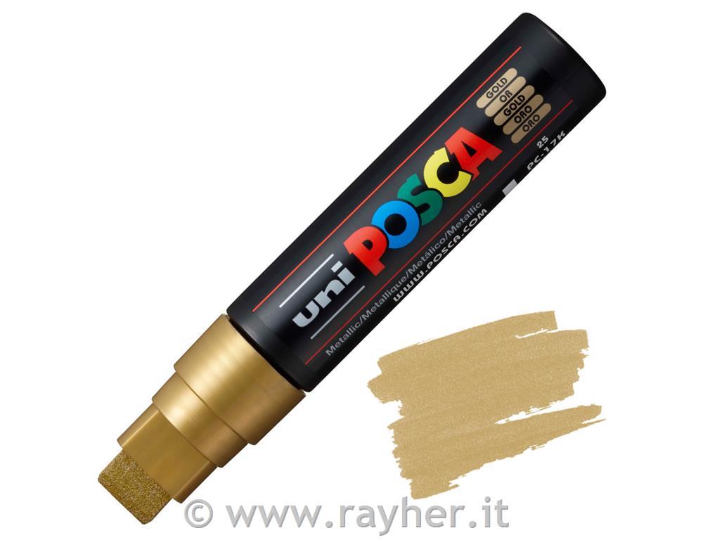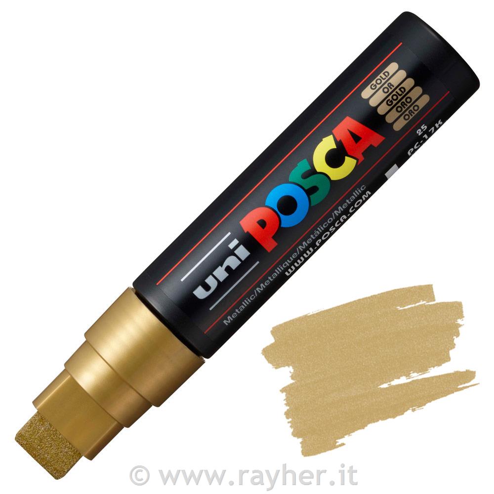 Izjemno široka konica PC-17K je s svojo velikostjo najboljši prijatelj umetnikov in strokovnjakov, ki izdelujejo obsežna dela. S konico PC-17K lahko umetniki slikajo popolna ozadja na velikanskih površinah in delajo pred občinstvom; navdušeni dekoraterji preoblikujejo sobe, pohištvo, tkanine in velike predmete; strokovnjaki pa okrasijo izložbe in transparente. Barva v uni POSCA flomastrih je nestrupena in je izdelana na vodni osnovi. Lahko jih uporabljate na skoraj vseh površinah, zato lahko svobodno izražate svojo ustvarjalnost. Pokrivna barva brez alkohola in topil dobro prekriva, se meša, hitro suši in jo je mogoče prekriti, ko je suha. Pisalo ima ventilni mehanizem za dobro zatesnitev barve in kroglico v ohišju, ki meša barvo, kar omogoča enakomerno konsistenco barve, teksturo in stalne optimalne rezultate. Konice pisal lahko sperete z vodo, v nekaterih serijah pa so obojestranske. Pokrovček zagotavlja zaščito in dolgo življenjsko dobo konice pisala. Priprava površine, na kateri boste flomaster uporabili, ni potrebna; te vsestranske markerje lahko uporabljate na papirju, steklu, kartonu, lesu, porcelanu, kovini, tekstilu, keramiki, plastiki, ipd. Lahko jih uporabljate tudi v akvarelni tehniki, če jih zmešate z vodo in čopičem. Obstojni na poroznih površinah in izbrisljivi na večini gladkih neporoznih materialov.