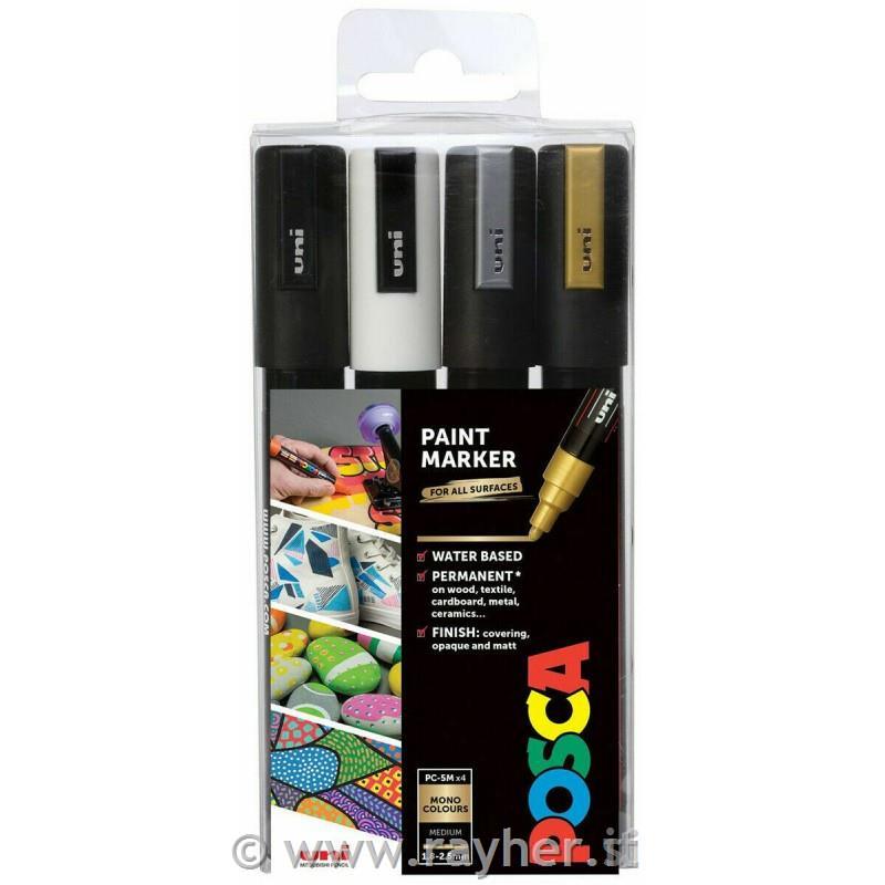 POSCA Uni flomaster; konica 1,8-2,5 mm; set 4 (črn, bel, zlat, srebrn)