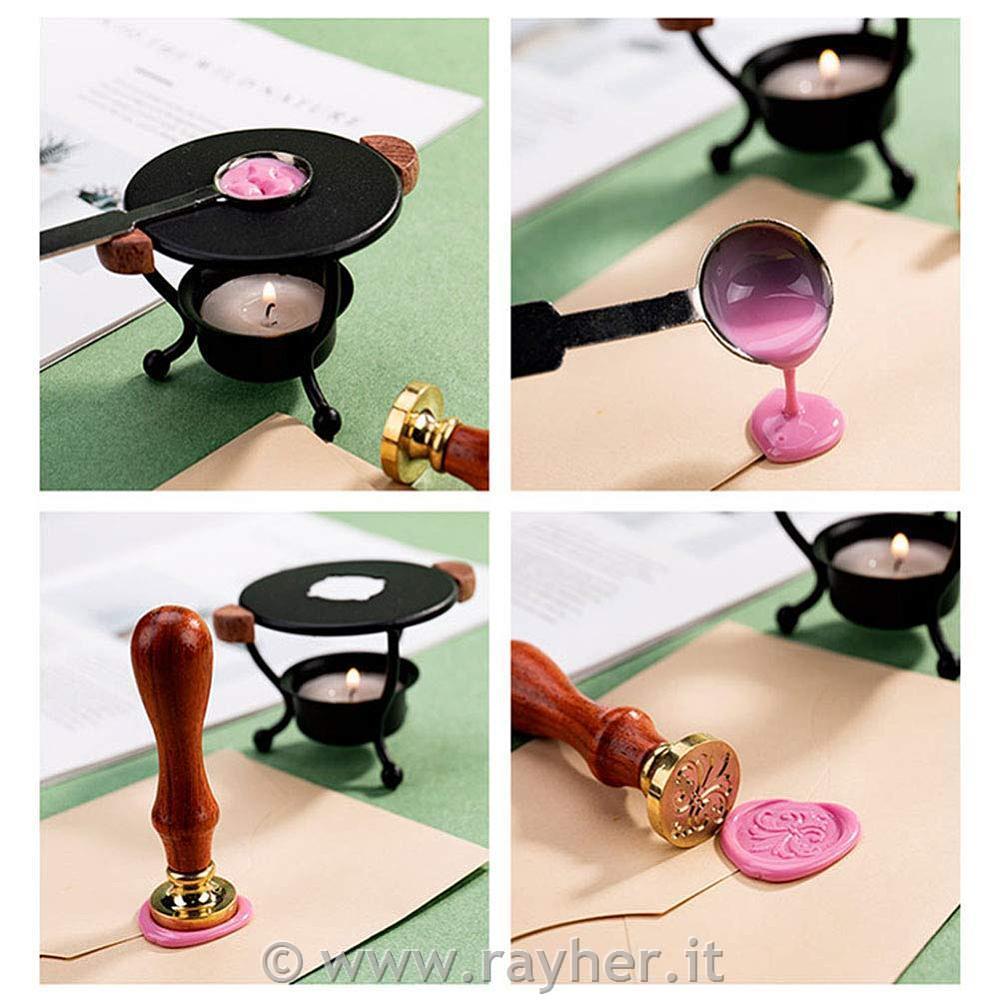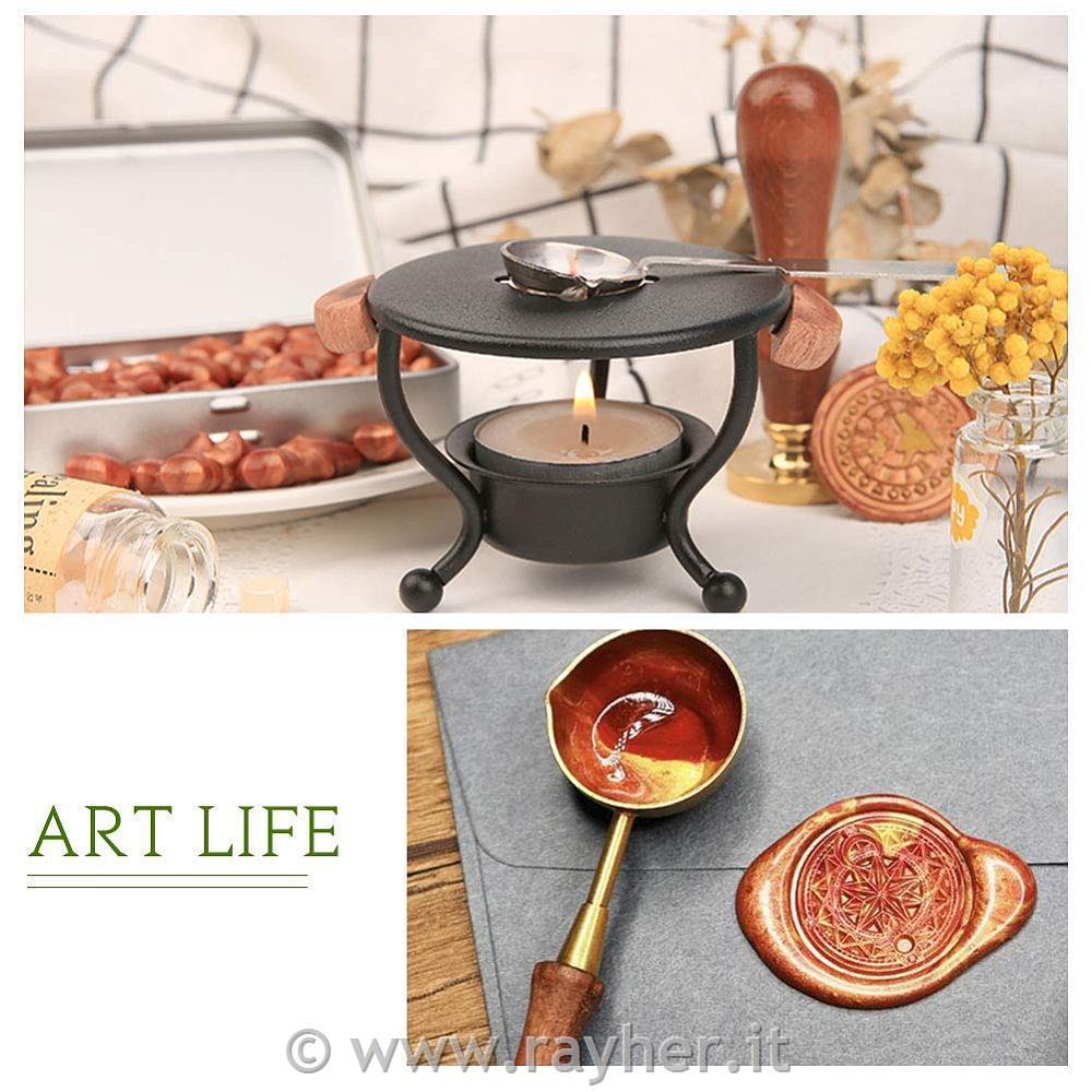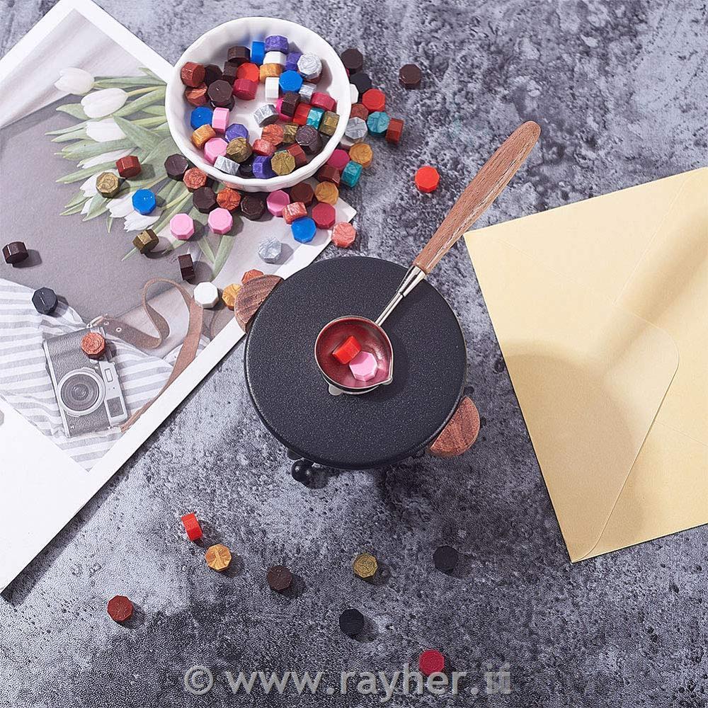 Komplet za voskanje in pečatenje, z lesenim gorilnikom za vosek, voskom v paličicah, žličko za taljenje, svečko in voskastimi delci v mešanih barvah.