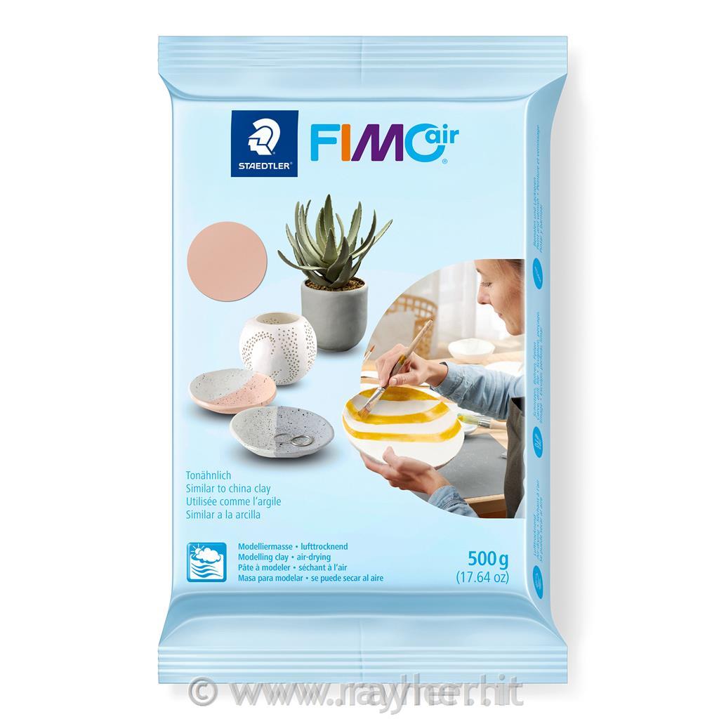 STAEDTLER® FIMO® air basic e una pasta modellabile simile all'argilla, che solodifica all'aria. Realizzata con 97% da materie prime naturali., non appiccicosa, gradevole al tatto e pronta all'uso. La massa e adatta anche per realizzare bambole e pupazzi, poiché il prodotto e leggero a causa delle fibre di cellulosa nella massa. Impastare e modellare bene la massa prima di modellare. Il tempo di asciugatura dipende dallo spessore del prodotto. NON asciugare la massa direttamente al sole, sul termosifone, in forno, perché un'essiccazione troppo rapida provoca crepe, durante l'essiccazione la massa si restringe di circa il 7%. Una volta essiccato, il prodotto puo essere ulteriormente lavorato (carteggiato, forato, verniciato, ...).