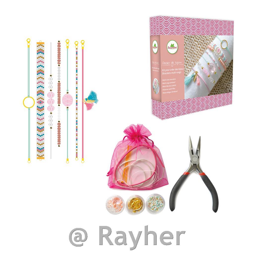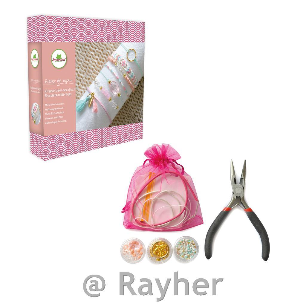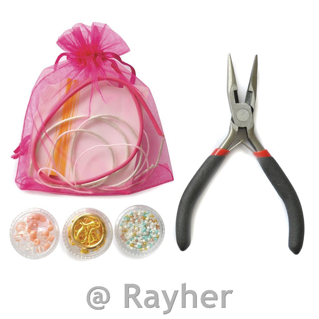 componenti per bigiotteria, cordini, pinze, ago, libretto con istruzioni illustrate.