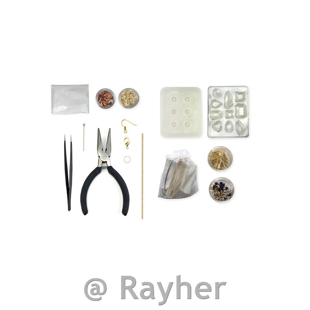 Il set include polvere di cemento creativa, due stampi in silicone, due misurini, due bastoncini di legno, foglia d'oro color oro e rame, pinze, pinzette, una catena e componenti per gioielli, perline e cordoncini, e un libretto con istruzioni illustrate.