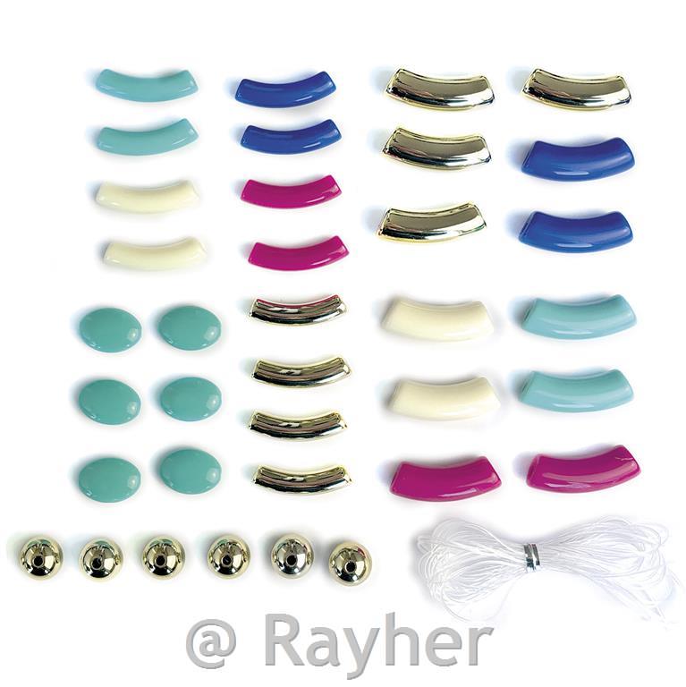 Il set contiene perline di varie forme, cordoncino elastico e un libretto con istruzioni illustrate.