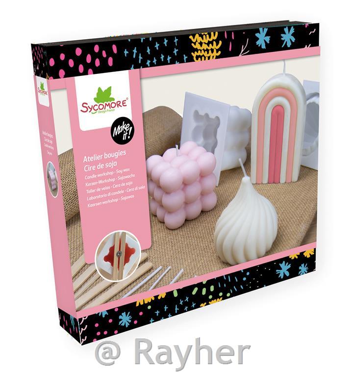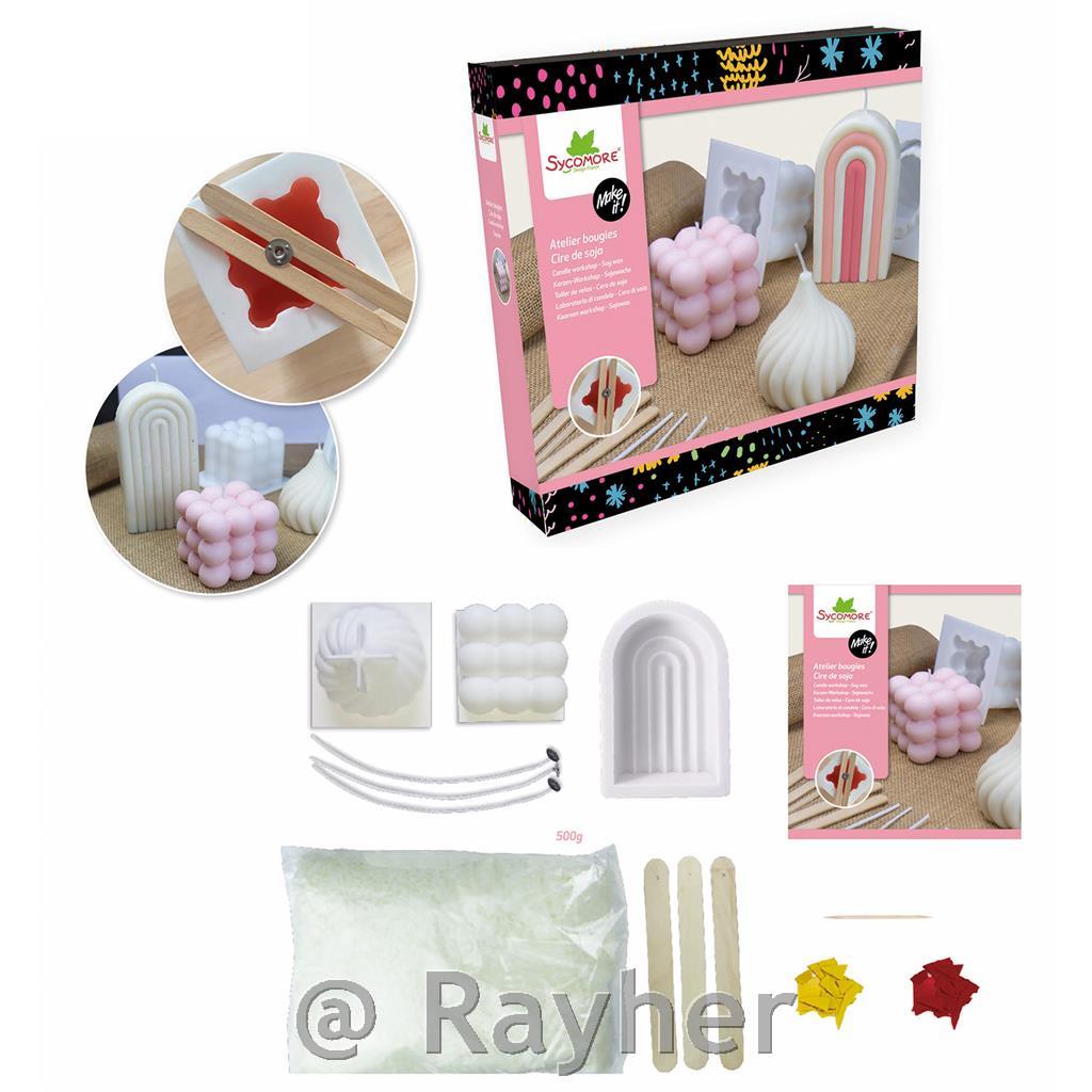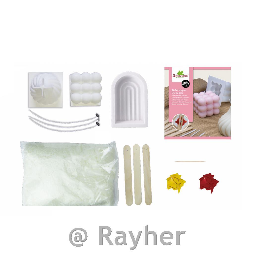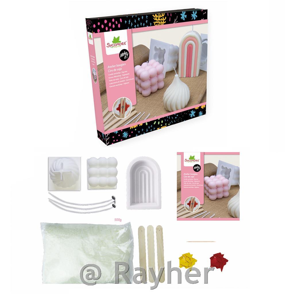 In this pretty box you will find every- thing you need to make 5 original and trendy candles. This box contains: 3 molds, 2 dyes, 600 g of soy wax powder, 5 wicks, 5 wooden stick, 1 syringe and 1 instruction.
