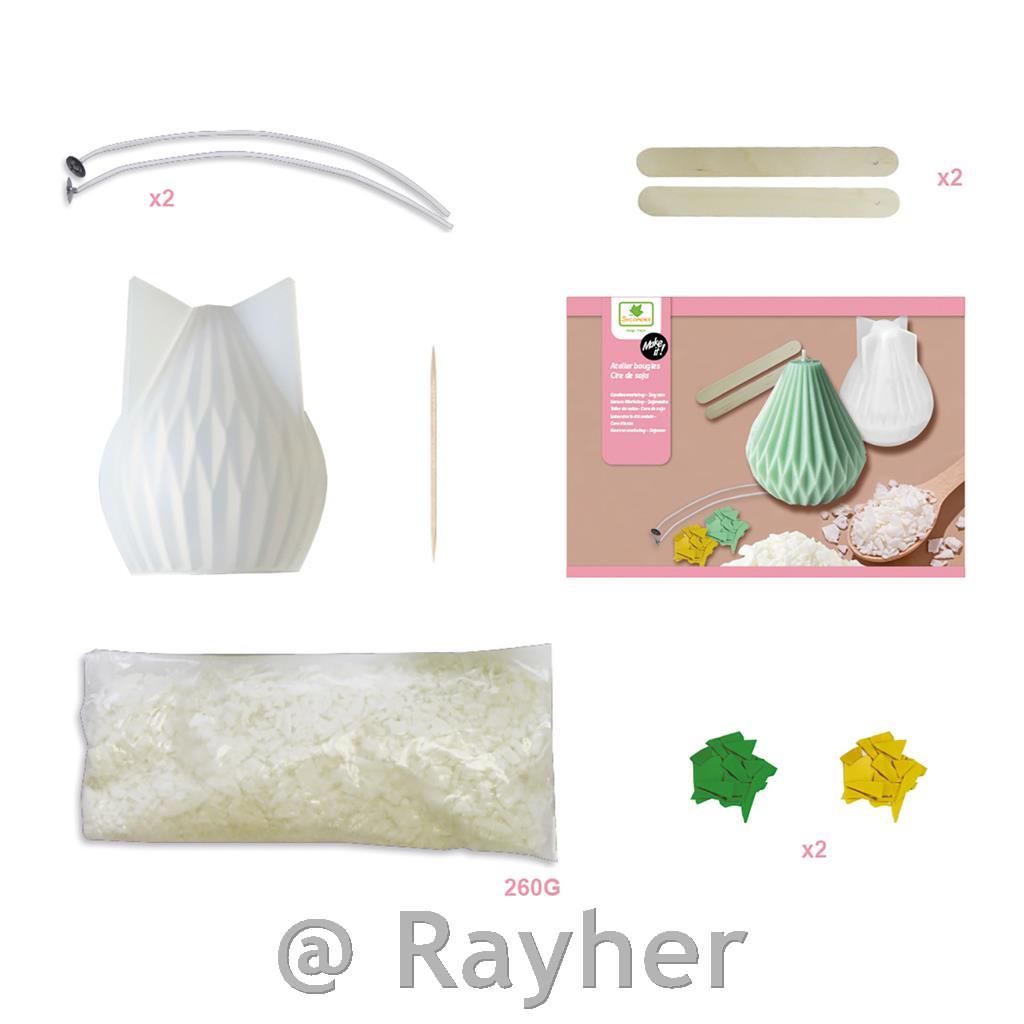 Il set contiene 260 g di cera di soia, uno stampo in silicone, 2 stoppini, 2 bastoncini, due coloranti e un libretto con istruzioni illustrate.