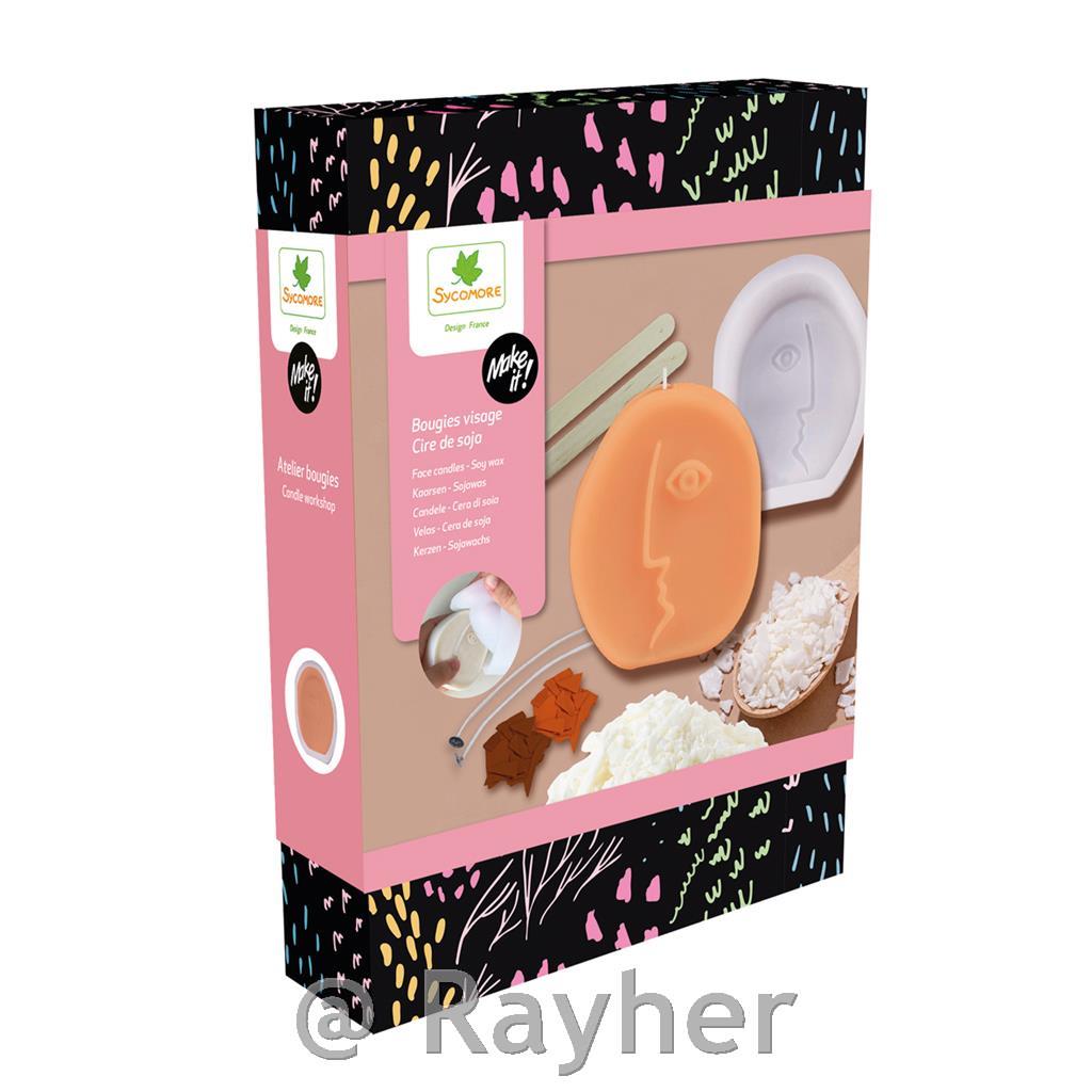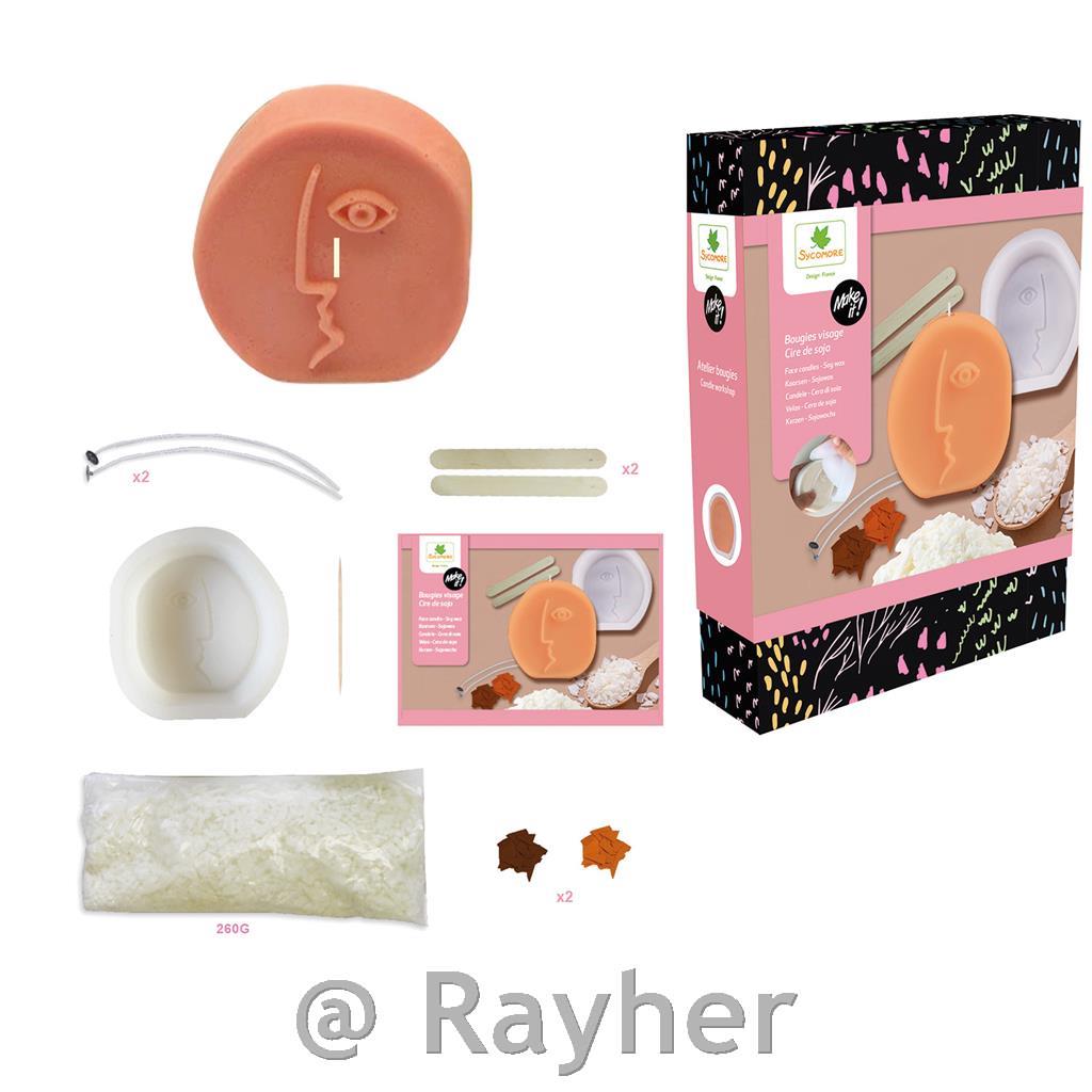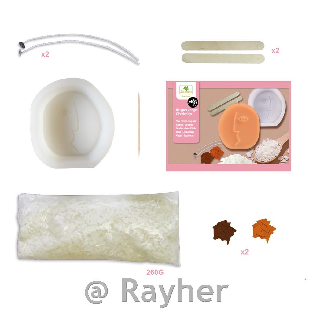 Il set contiene 260 g di cera di soia, uno stampo in silicone, 2 stoppini, 2 bastoncini, due coloranti e un libretto con istruzioni illustrate.