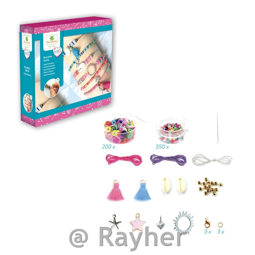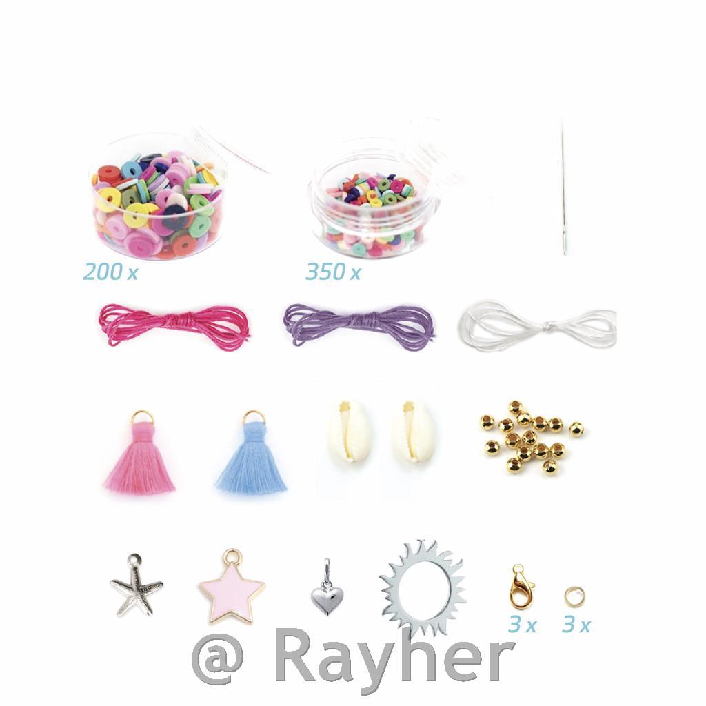 Il set contiene 200 perline Heishi piu grandi, 350 perline Heishi piu piccole, cordoncini, elementi decorativi, fermagli e un libretto con istruzioni illustrate. Segui le istruzioni illustrate per creare braccialetti a tuo piacimento. Consigliato per bambini dai 7 anni in su.