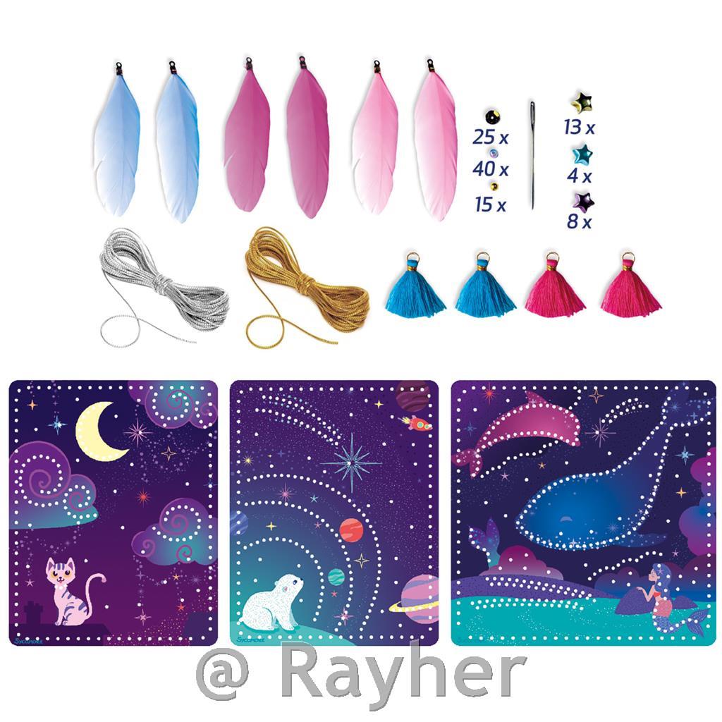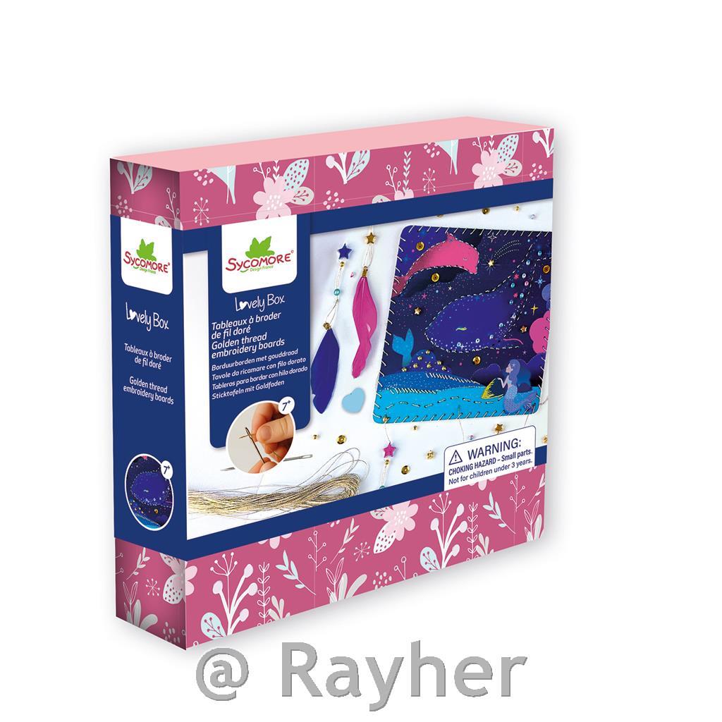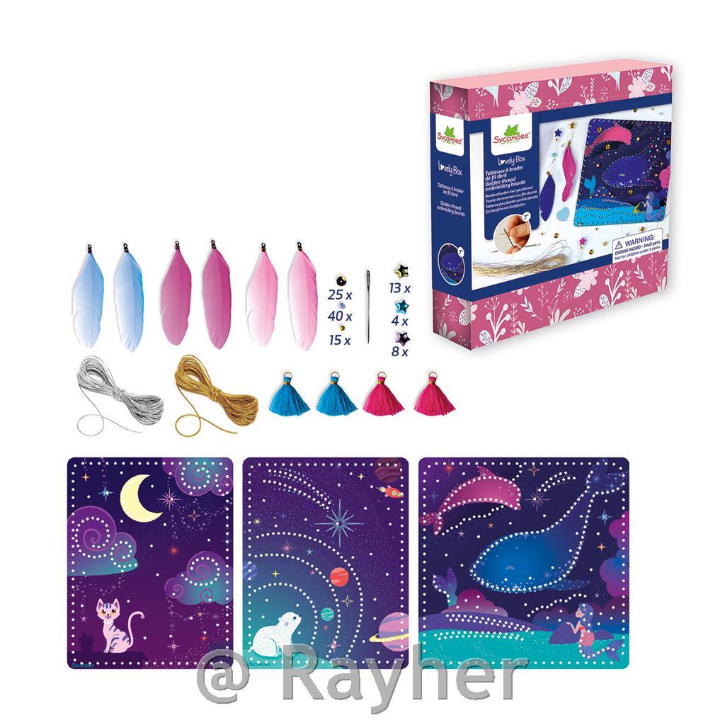 Inside this beautiful box, you’ll find everything you need to create 3 illustrated and embroidered cards, adorned with golden thread, sequins, and golden beads in various shapes._x000B_Contents: 3 printed cards, golden thread, feathers, beads, charms, and a step-by-step guide to accompany you throughout your creations.