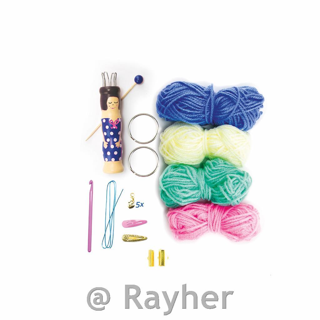 Il set include 4 gomitoli di lana colorati per lavorare a maglia, un topolino per lavorare a maglia, un uncinetto, filo metallico, un elemento decorativo, fermagli per capelli, portachiavi, un elemento decorativo, un libretto con istruzioni illustrate. Consigliato per bambini dai 7 anni in su.