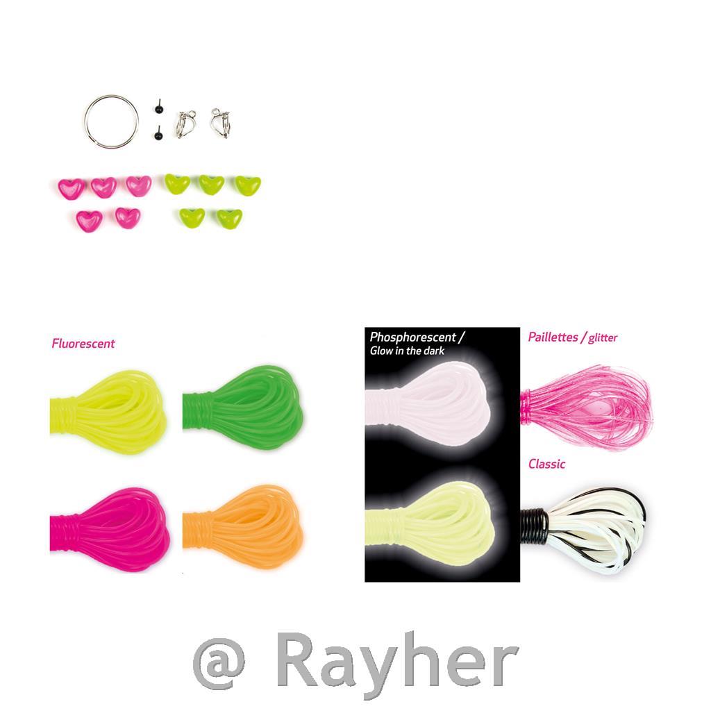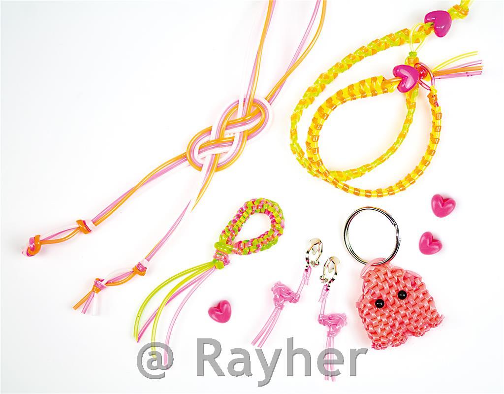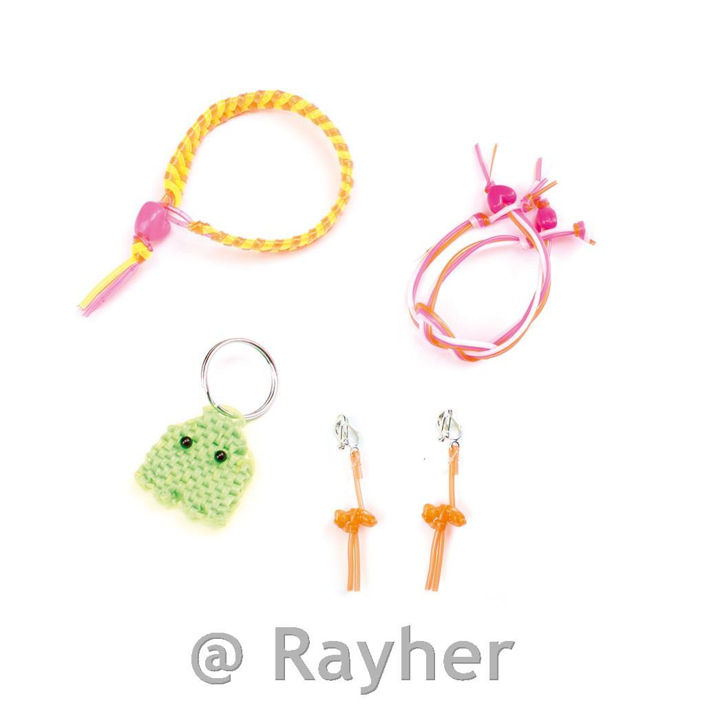 Il set contiene 64 fili scoubidou di diversi colori, 1 portachiavi, 1 paio di basi per orecchini, ciondoli terminali e un libretto con istruzioni illustrate. Crea gioielli a tuo piacimento con diverse combinazioni di lavorazione. Segui le istruzioni illustrate con il nodo e i ciondoli per completare il braccialetto. Consigliato per bambini di eta superiore ai 7 anni.