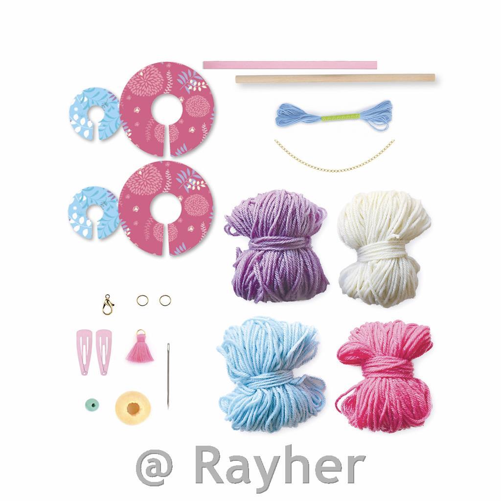 Il set contiene 4 fili di lana colorati, 4 basi per realizzare trecce, cordino per collegare, catenina con moschettone, perline di legno, fermagli per capelli, ago, matita e libretto di istruzioni illustrate. Consigliato per bambini dai 7 anni in su.