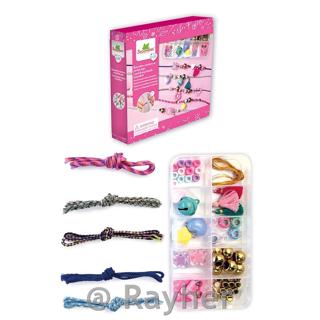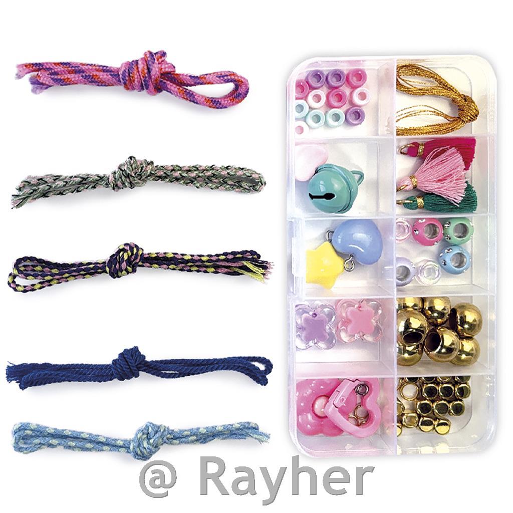 Il set contiene cinque cordini diversi, elementi decorativi (perline, ciondoli, paillettes), un libretto di istruzioni illustrate. Crea fino a cinque braccialetti a tuo piacimento con diverse combinazioni di elementi decorativi. Segui le istruzioni illustrate con un nodo macrame e il filo dorato incluso per completare il braccialetto. Consigliato per bambini dai 7 anni in su.