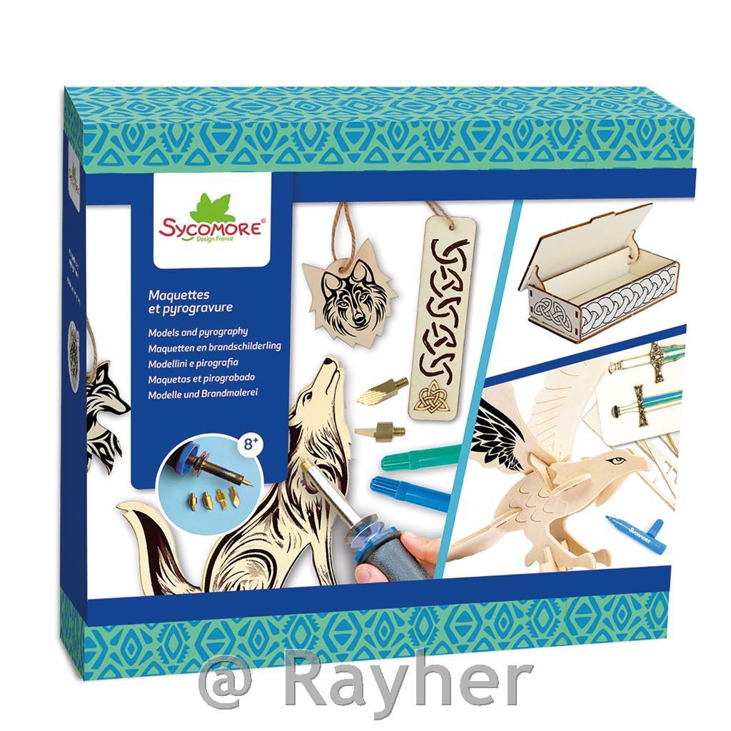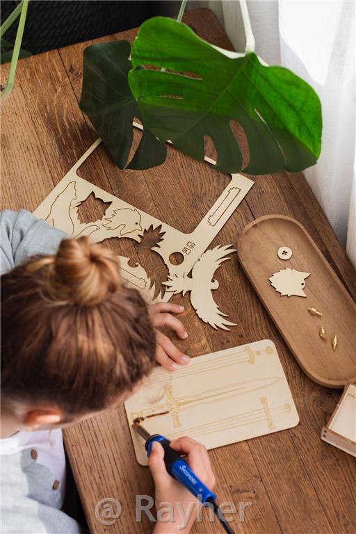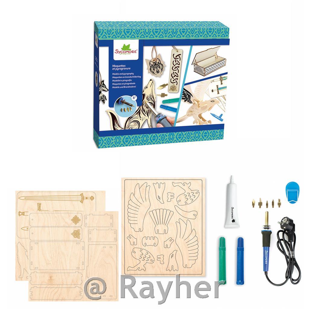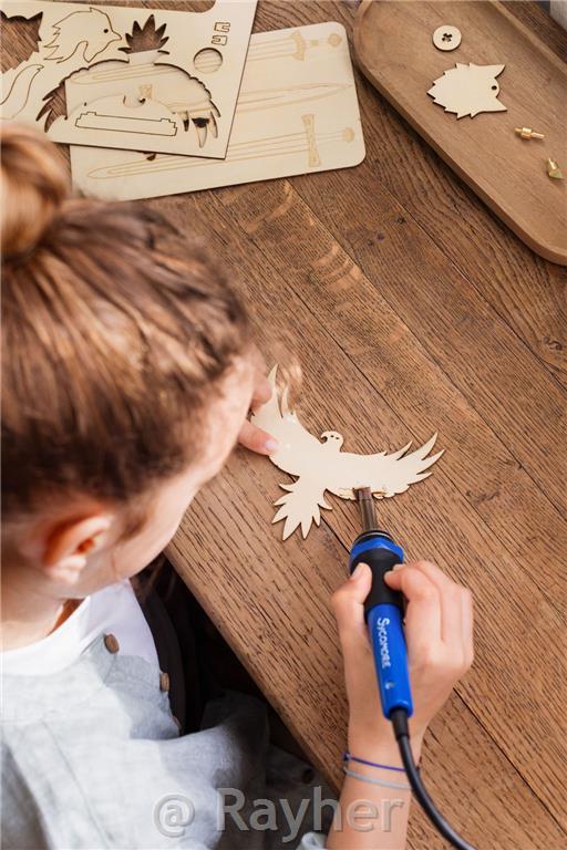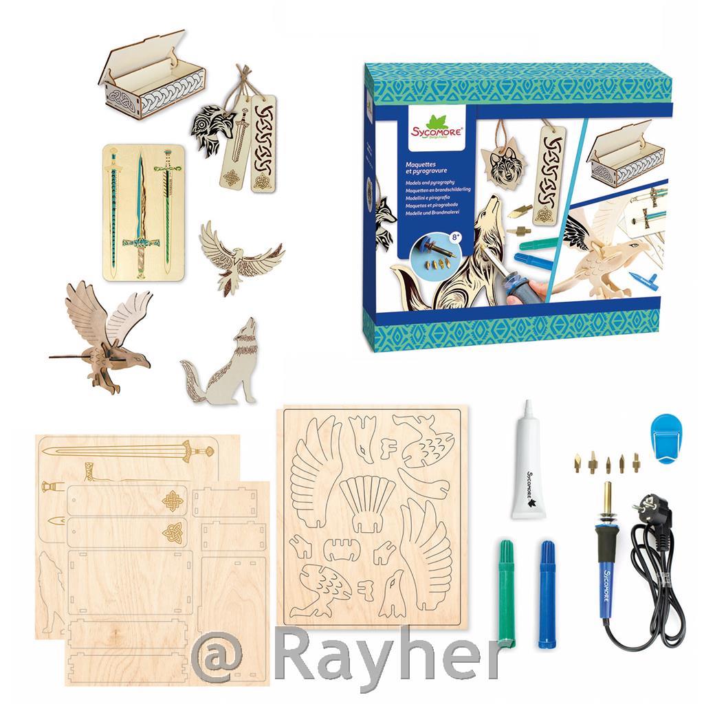 In this box, you'll find a complete set of pyrography tools. Make an eagle model, assemble your treasure box, practice on the sword board, decorate them with engraving or color them with felt-tip pens. Create key-rings and decorative book marks.