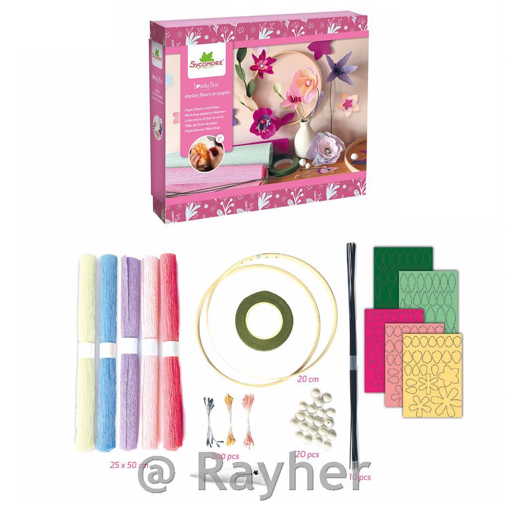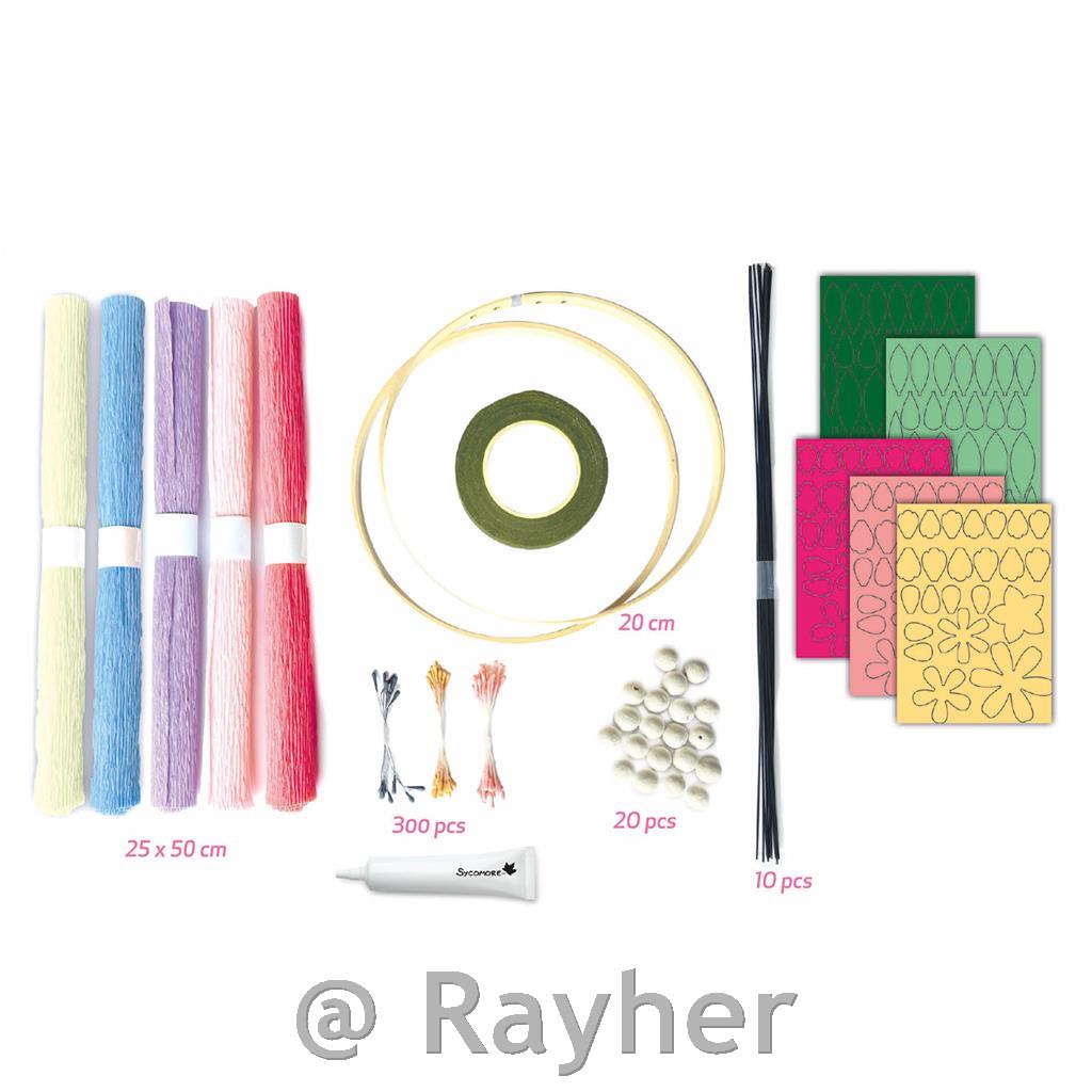 Includes: 5 colors of crepe paper (25 x 50 cm), 5 pre-cut paper sheets, 2 bamboo hoops, white glue, 300 stamens, 10 stems, 20 paper beads, 1 floral tape, and an instruction booklet.