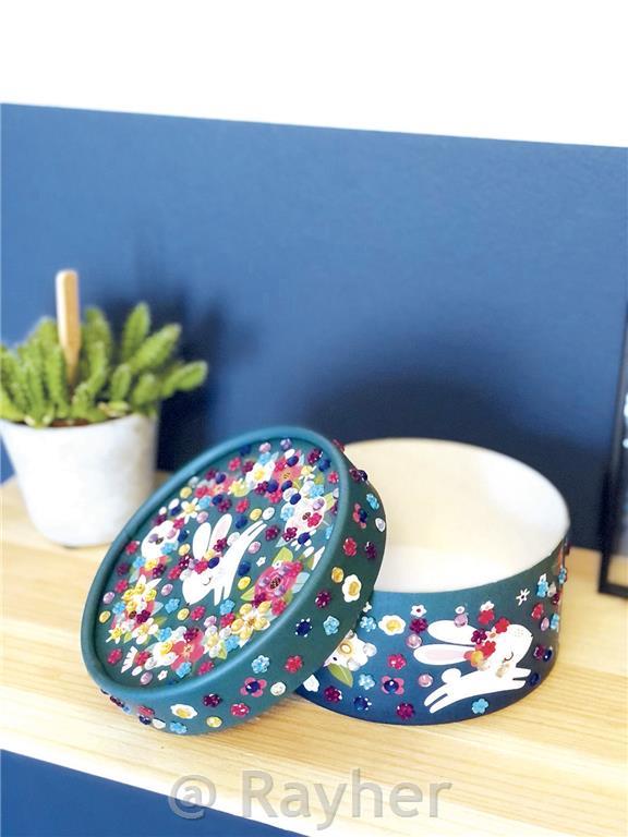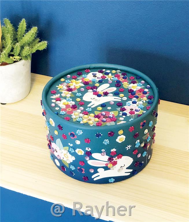 Decorate a beautiful round box, just stick the foam mosaics and sparkling jewels onto the corresponding graphics! Contains: 1 round box (11,5x 11,5 x 7 cm), more than 350 gems and 1 instruction leaflet.