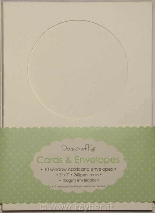Set vsebuje 10 vizitk z okroglim okencem in 10 kuvert, bele barve. Velikost 12,7 x 17,7 cm.
