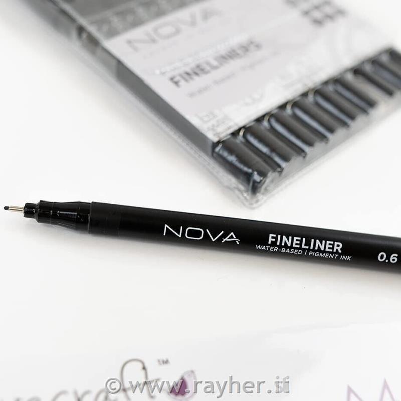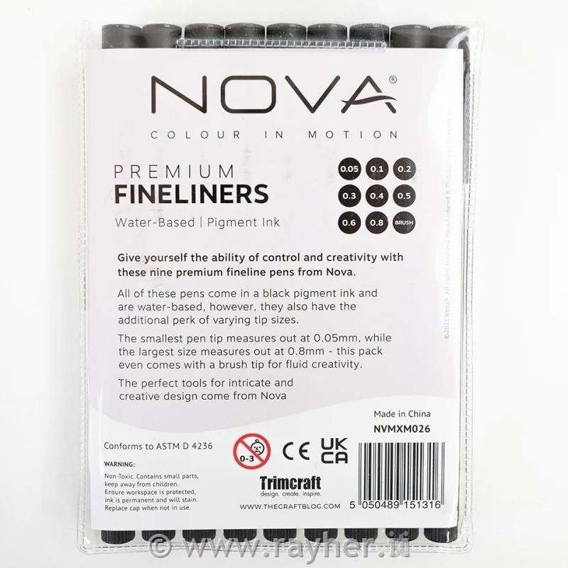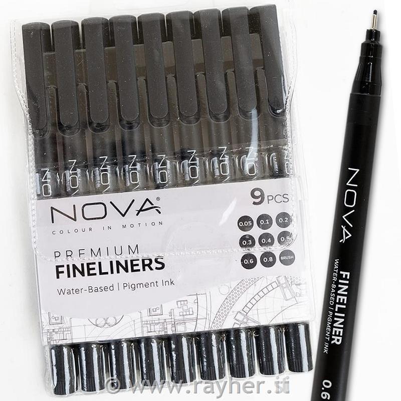 Devet premium linerjev za fino pisanje blagovne znamke Nova ima različno velike konice.