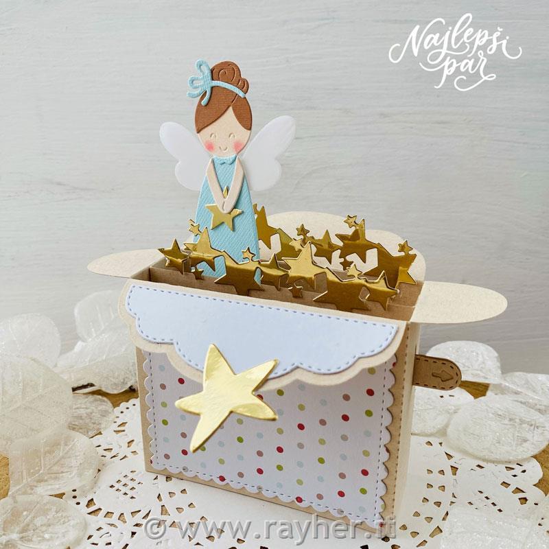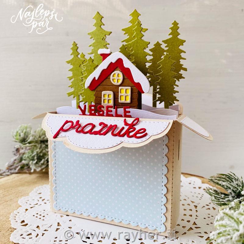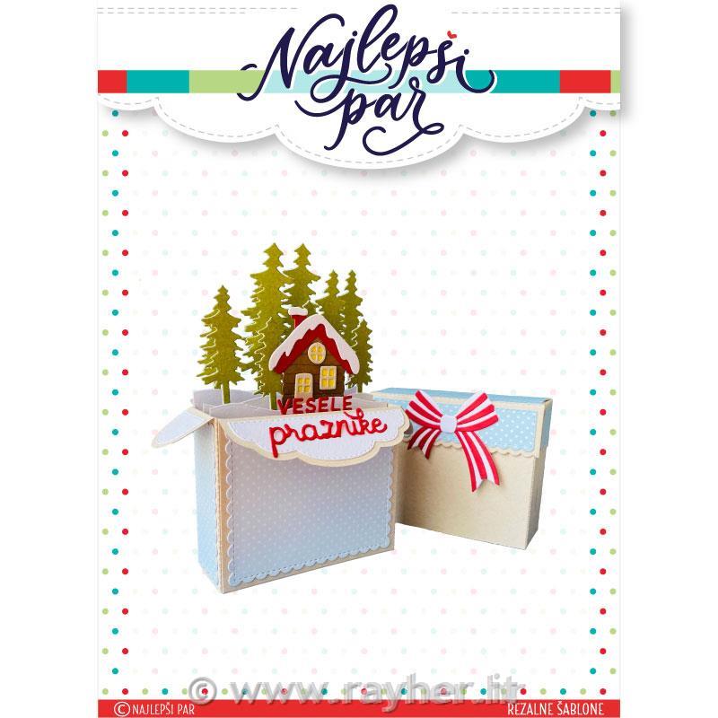 V kompletu je 9 rezalnih šablon. Šablone lahko uporabimo za izdelavo pop-up voščilnice ali pa z njo izdelamo klasično škatlico za drobne pozornosti in jo zapremo s pokrovom.