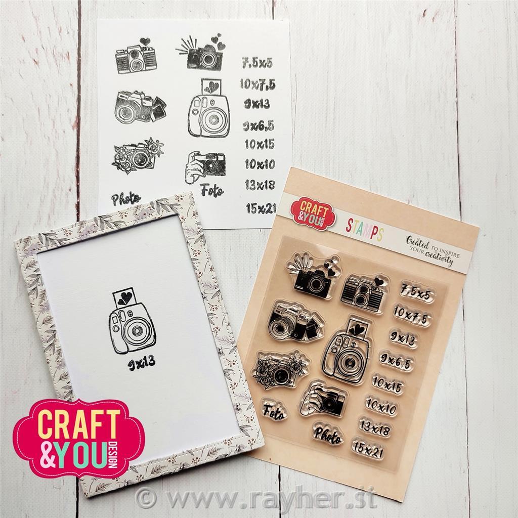 Dim.: največji fotoaparat: 3x2,2 cm, Foto: 1,2x0,6 cm, Foto: 1,3x0,6 cm, 10x7,5: 1,7x0,5 cm, v paketu je 16 štampiljk