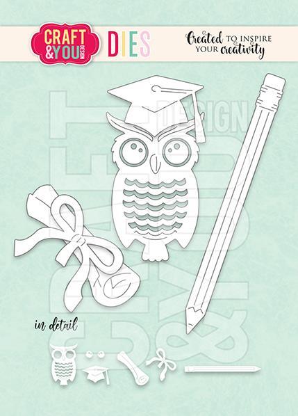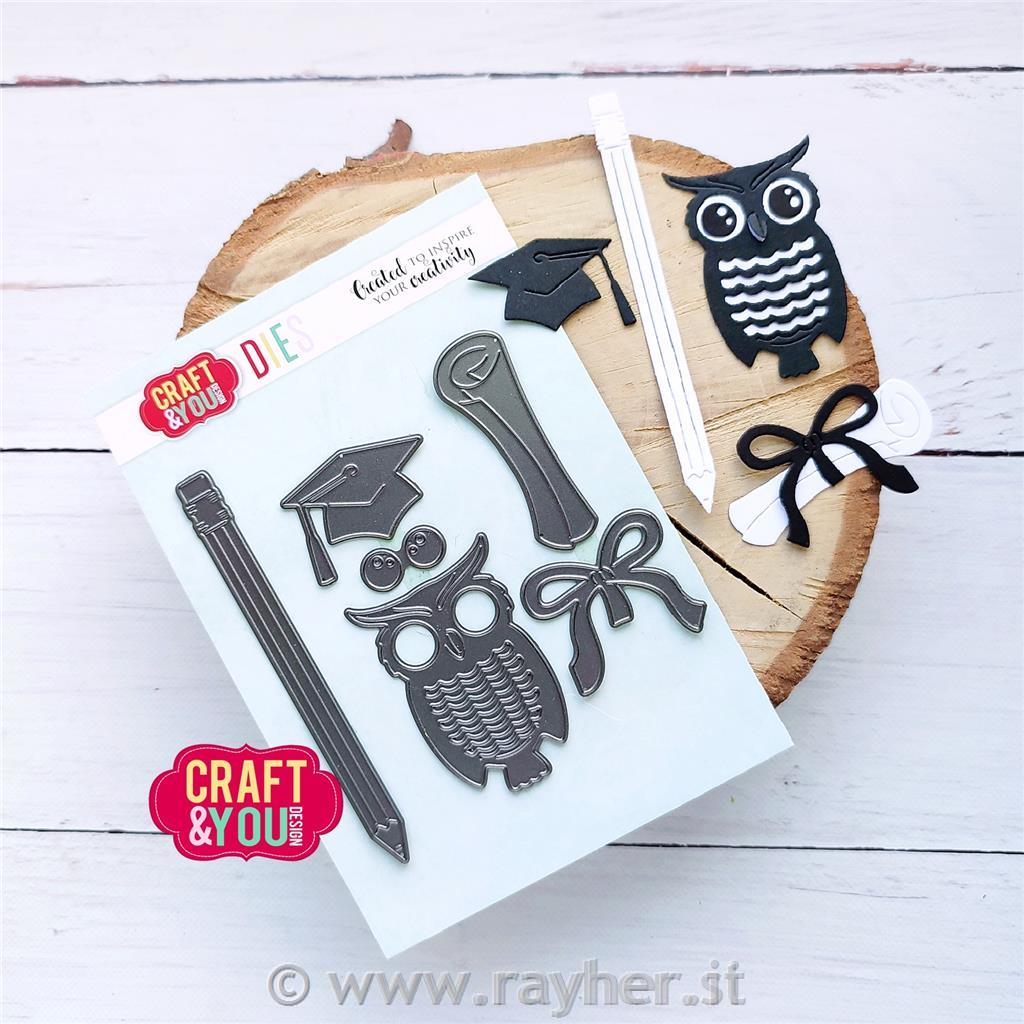 Komplet 5 rezalnih šablon. Približne mere: svinčnik 10x0,7 cm; sova 5,5x3,5 cm, kapa 3,5x2,5 cm; diploma 5,2x1,7 cm, pentlja 3,5x3 cm
