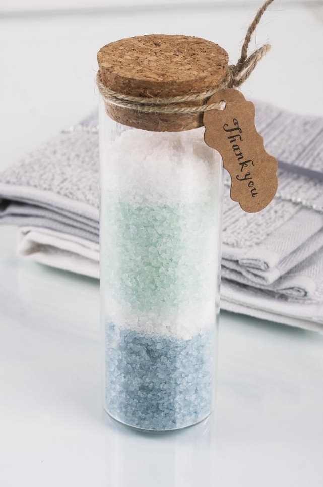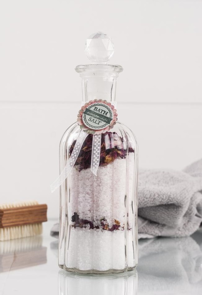 Kopalna sol v stekleni posodi je lahko lepo darilo in dekoracija v kopalnici.