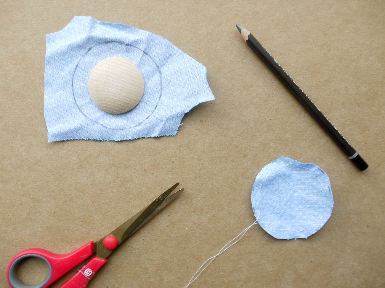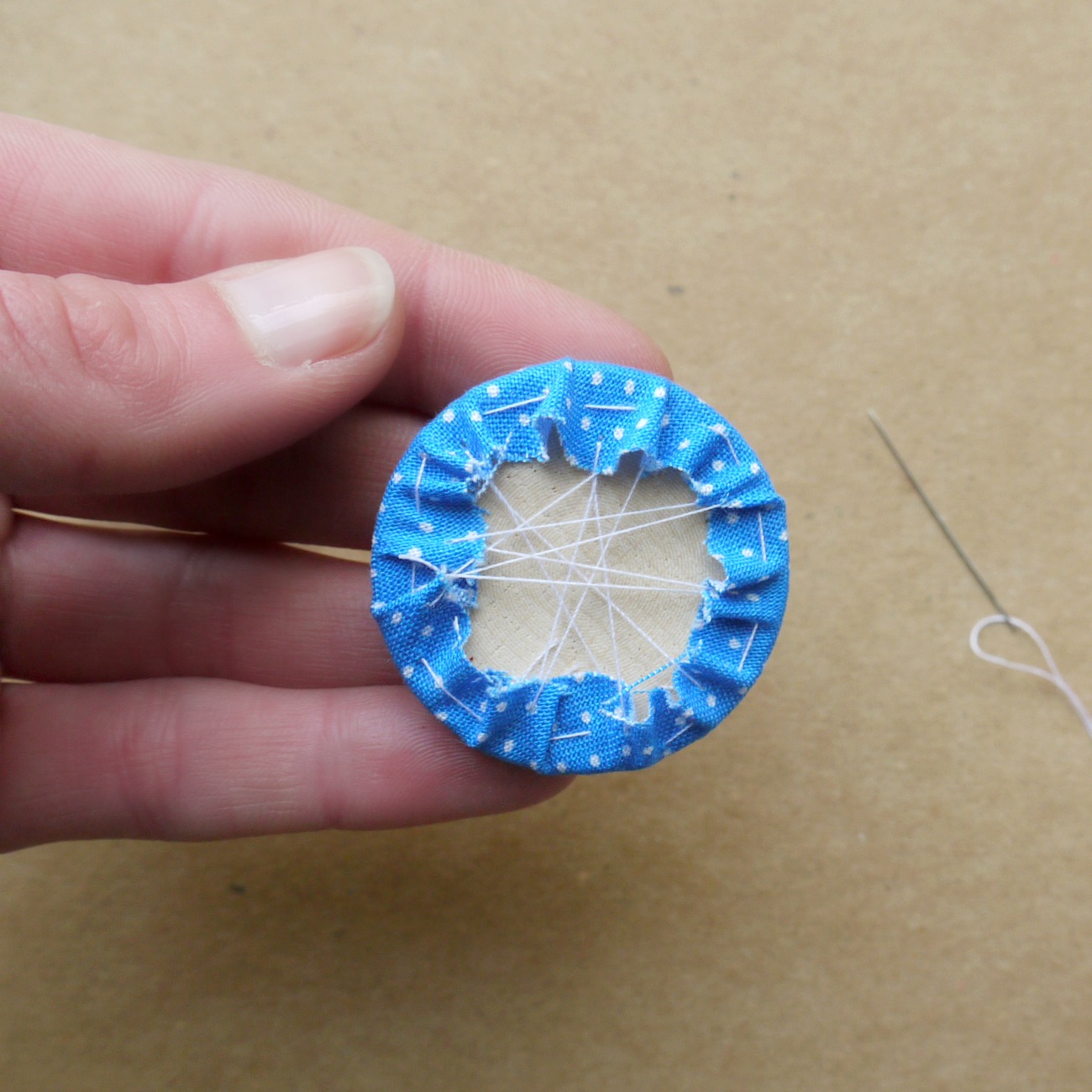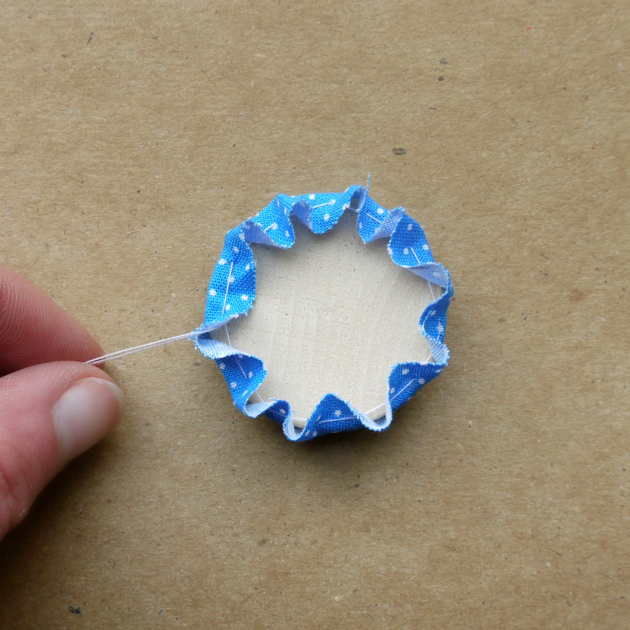 Na sredino obšitega blaga položimo disk in sukanec previdno potegnemo skupaj, da se blago napne okoli diska. Z dodatnimi šivi ga še nekoliko utrdimo.