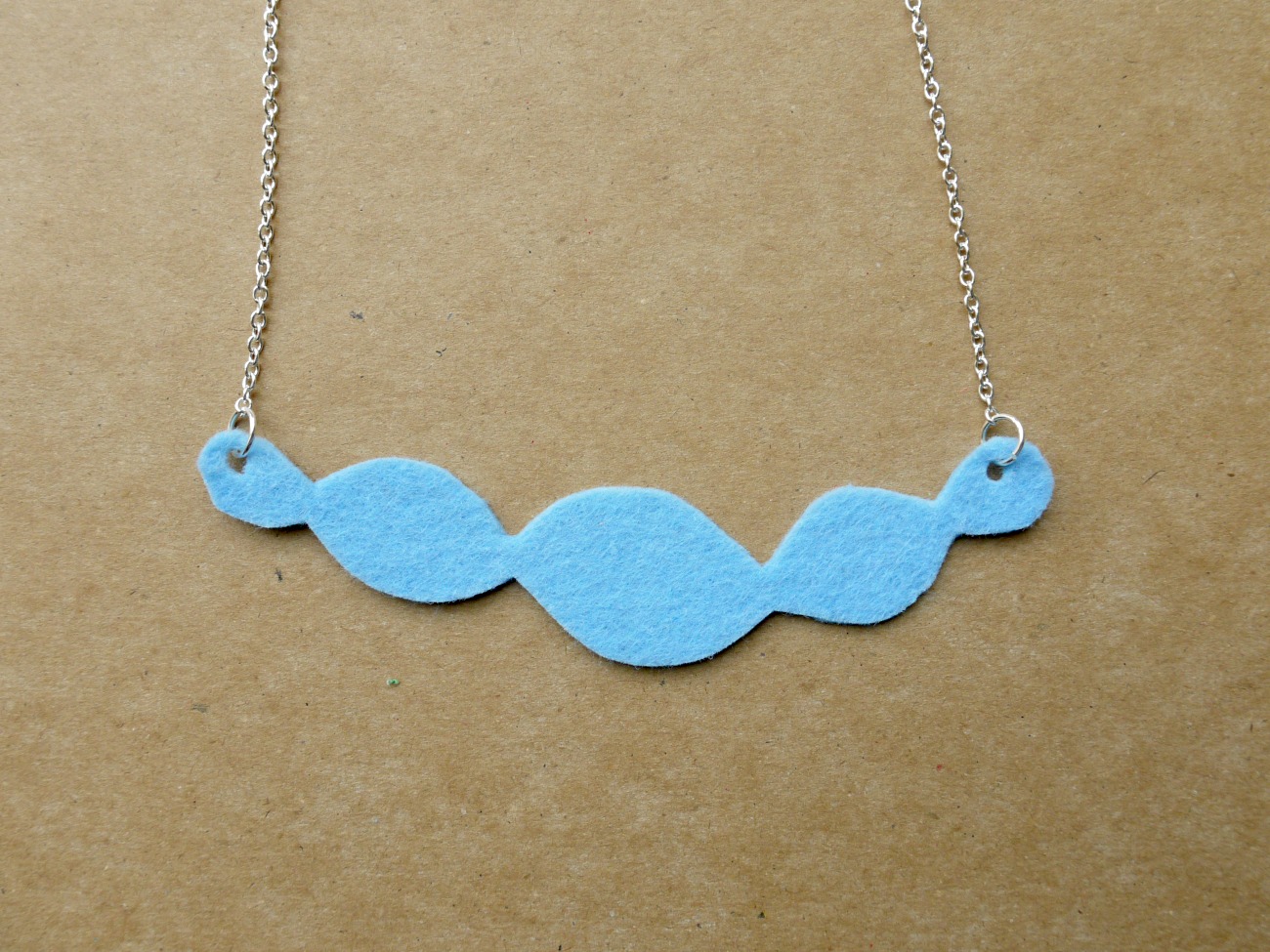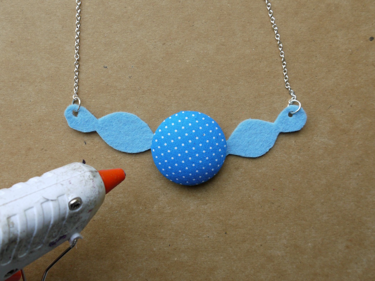 Oblečene diske poljubno zložimo na kos tršega filca in jih obrišemo. To bo osnova, na katero bomo kasneje z lepilno pištolo zalepili diske. Osnovo izrežemo tako, da bo za nekaj milimetrov manjša in bo pod diski lepo skrita. Na osnovi na vsaki strani naredimo luknjo, skozi katero pritrdimo obroček z verižico.