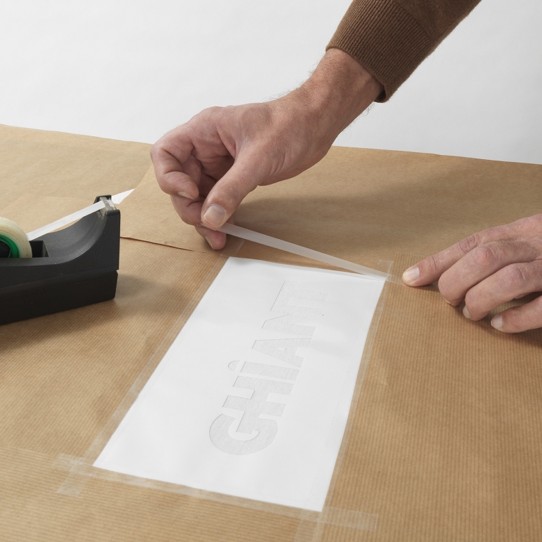 Posizionare lo stencil sul tessuto, e attorno per protteggere, mettere uno o due strati di carta.