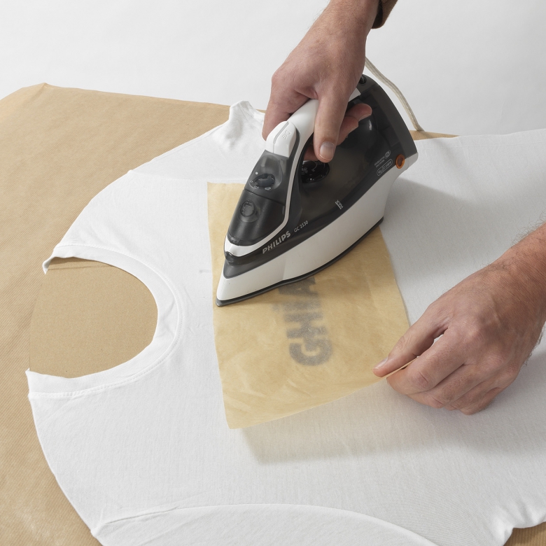 Quando la vernice è asciugata, rimuovere lo stencil. Mettere sul motivo la carta da forno e stirare a una temperatura alta. La carta da forno deve essere posizionata anche sotto la superficie verniciata per impedire l'eventuale trasferimento di colore sul retro della maglietta.
