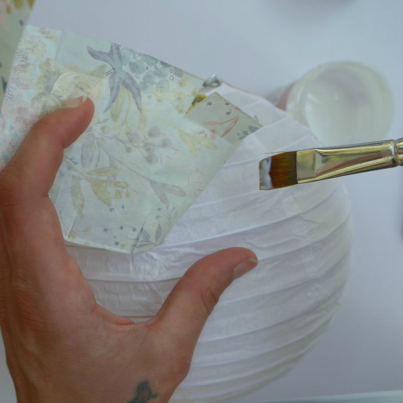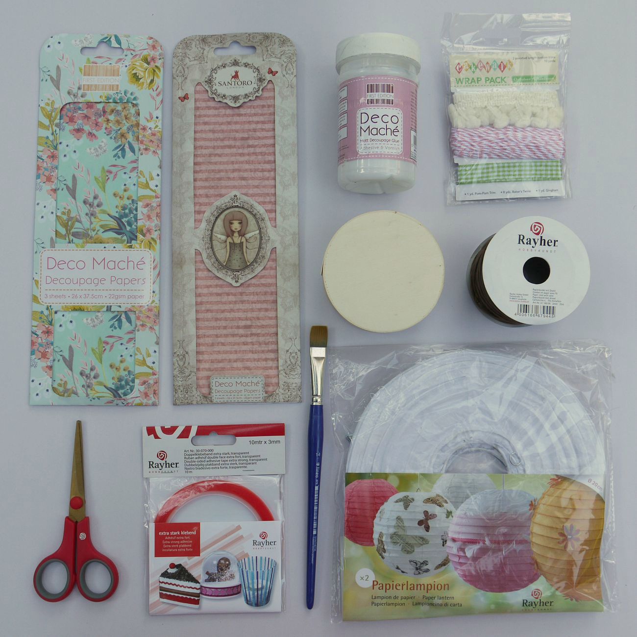 Necessitiamo: una lanterna di carta, carta decupage, una scatola di legno rotonda, un pennello, colla Scothc, Decomache medium per decupage, forbici, nastro di carta e dei nastri decorativi.