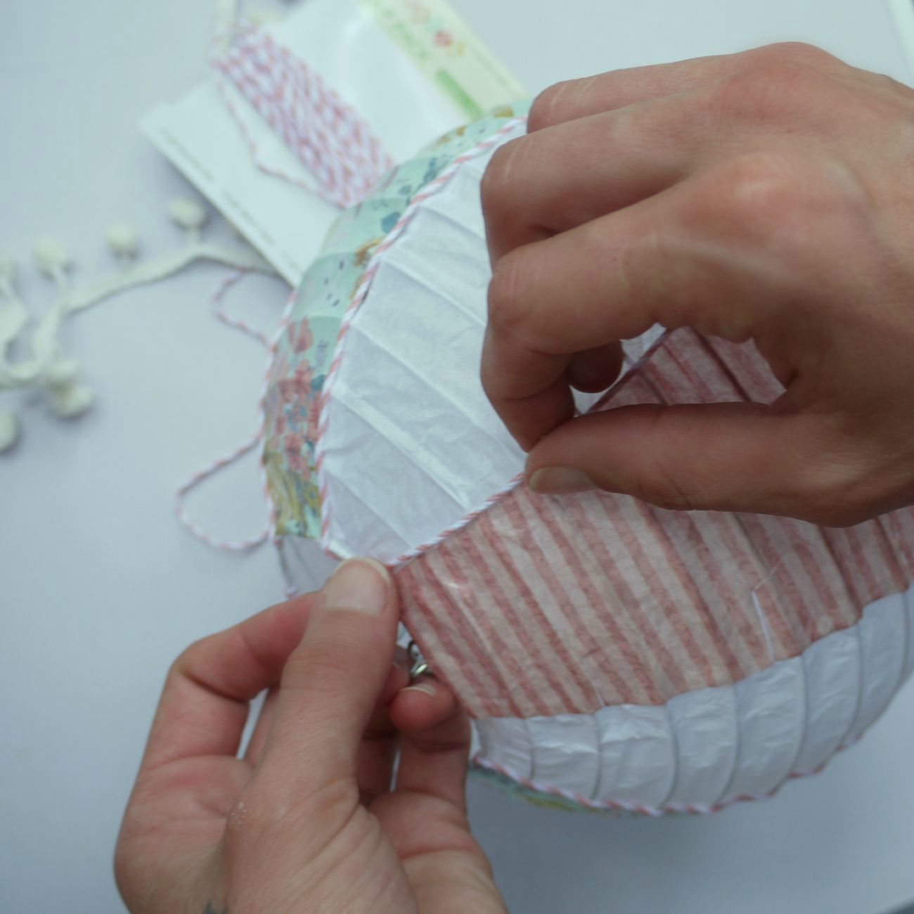 Rileghiamo il cestino alla lanterna aiutandoci con uno spago fatto passare oltre due buchi nel cestino.