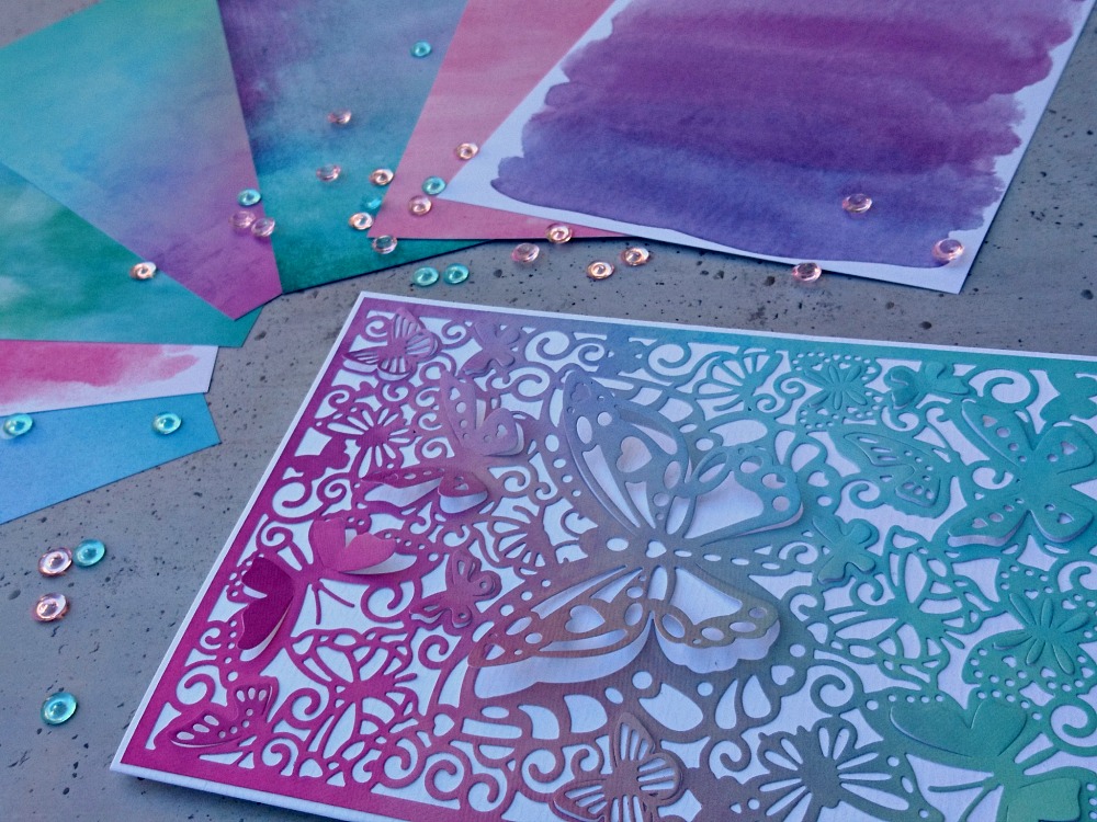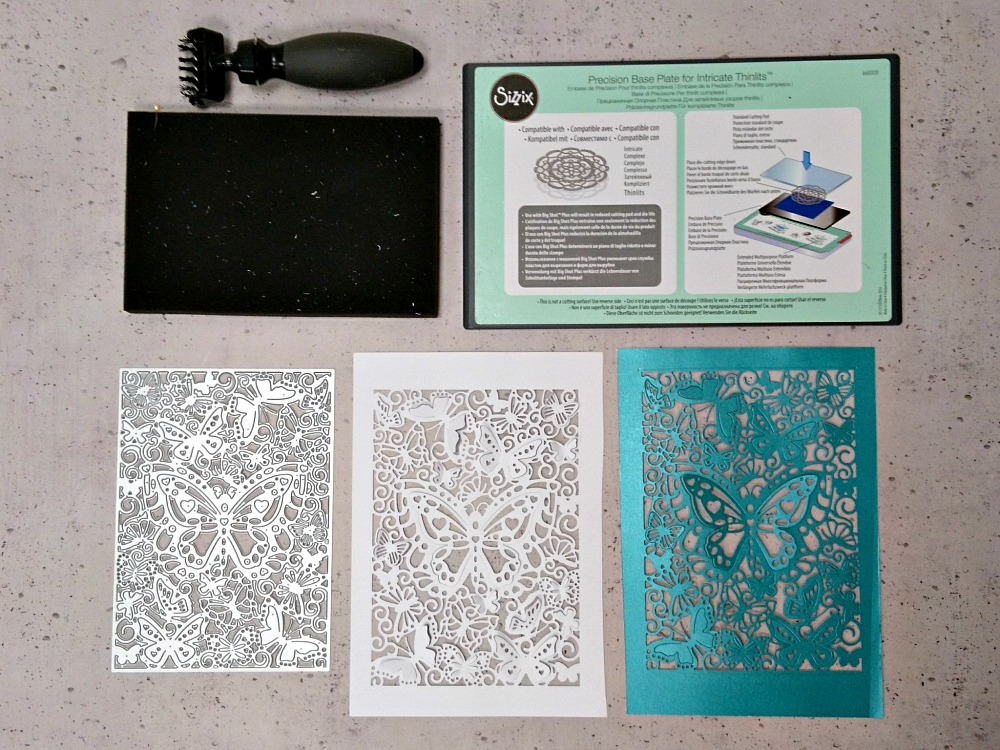Za izrezovanje je najbolj primeren karton do debeline 220 g. Delo si močno olajšamo z uporabo Precision kovinske plošče, ki nam omogoči natančen izrez s tankimi kovinskimi šablonami, ki imajo veliko podrobnosti.